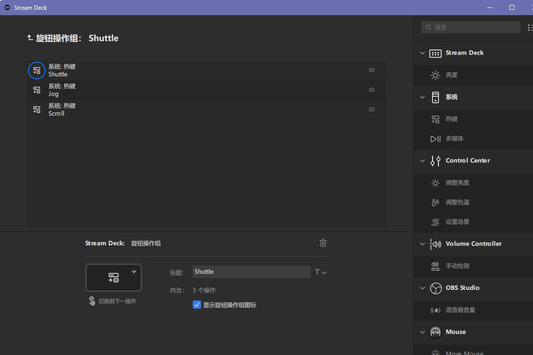 也正是因为Stream Deck 可以直接通过插件和软件沟通,所以软件内的功能可以直接用Stream Deck来调用,通过拖放预设好的软件功能并选择属性即可完成配置,而并非需要像传统快捷键设置那么复杂,也不会造成单纯快捷键操作而产生的热键冲突问题。