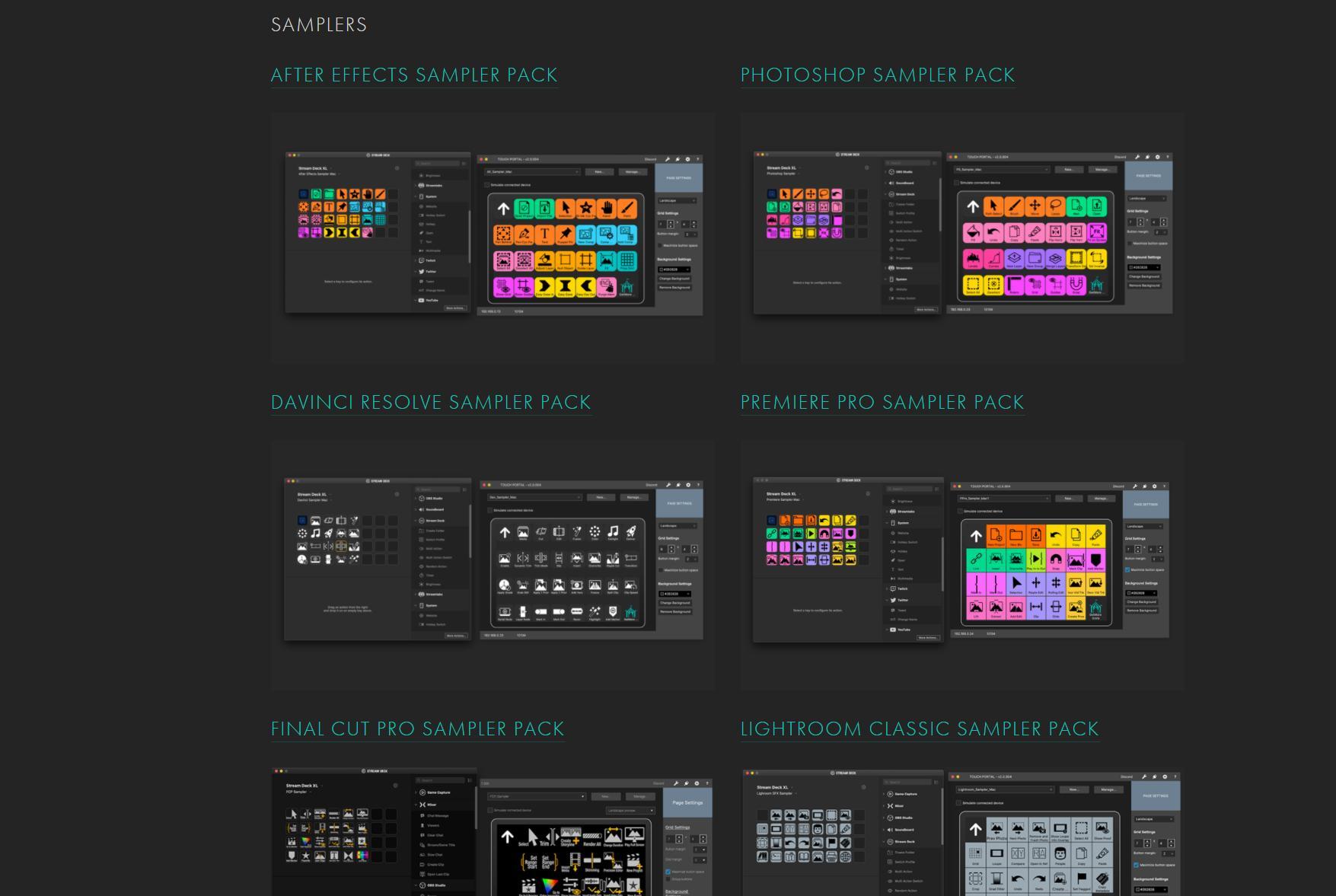 如果你和我一样,出于生产力需求入手的Stream Deck +,你可以在这个名为sideshowfx网站上,购买下载到现成的预设配置文件,然后再根据自己的需求来修改。这个网站提供的预设非常多,而且功能非常全,免费版和付费版都有,预设下载下来后,直接双击就可以应用了,非常的方便。生产力软件的快捷键太多了,又复杂,自己挨个设置的话,特别浪费时间。