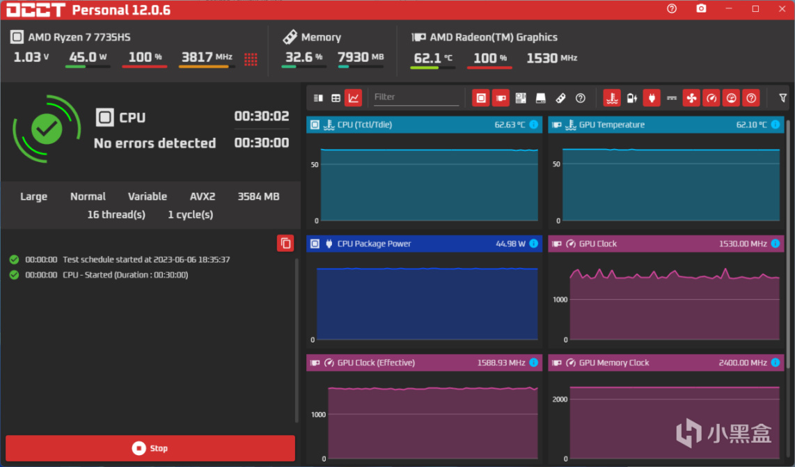 前面已经介绍过,无界S锐龙版的散热系统设计得十分给力,那么实战测试如何?我们使用Furmark、Cinebench R23和OCCT进行考机。处理器用Cinebench R23单考情况下,爆发封装功率会达到65W之高,然后稳定在54W水平;GPU使用Furmark考机,此时封装功率会稳定在45W;最后用OCCT进行处理器+GPU双考,封装功率也是保持在45W水平。温度方面,可以看到满载考机30分钟处理器封装温度也没到63℃(风扇满速状态),对于0.75L的机身体积来讲,这个散热效果可以说是相当出色了,完全可以保证玩家长时间满载使用的稳定