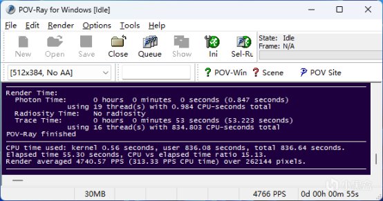 ▲POV-Ray渲染测试使用时间为55.3秒