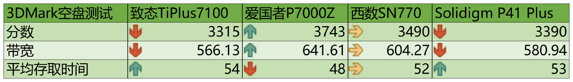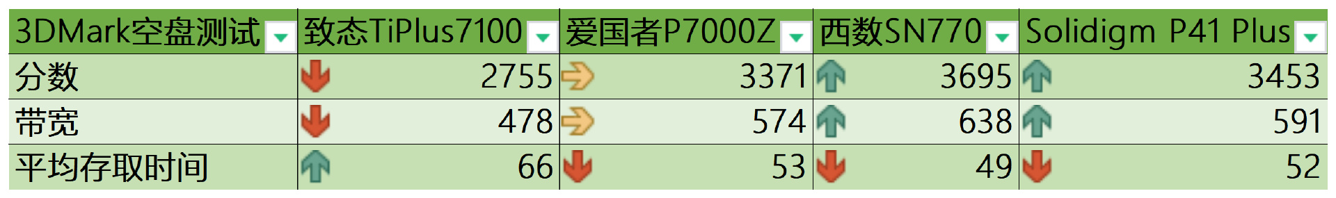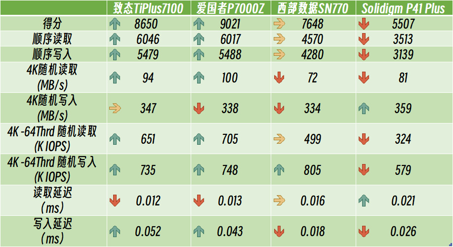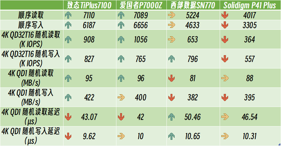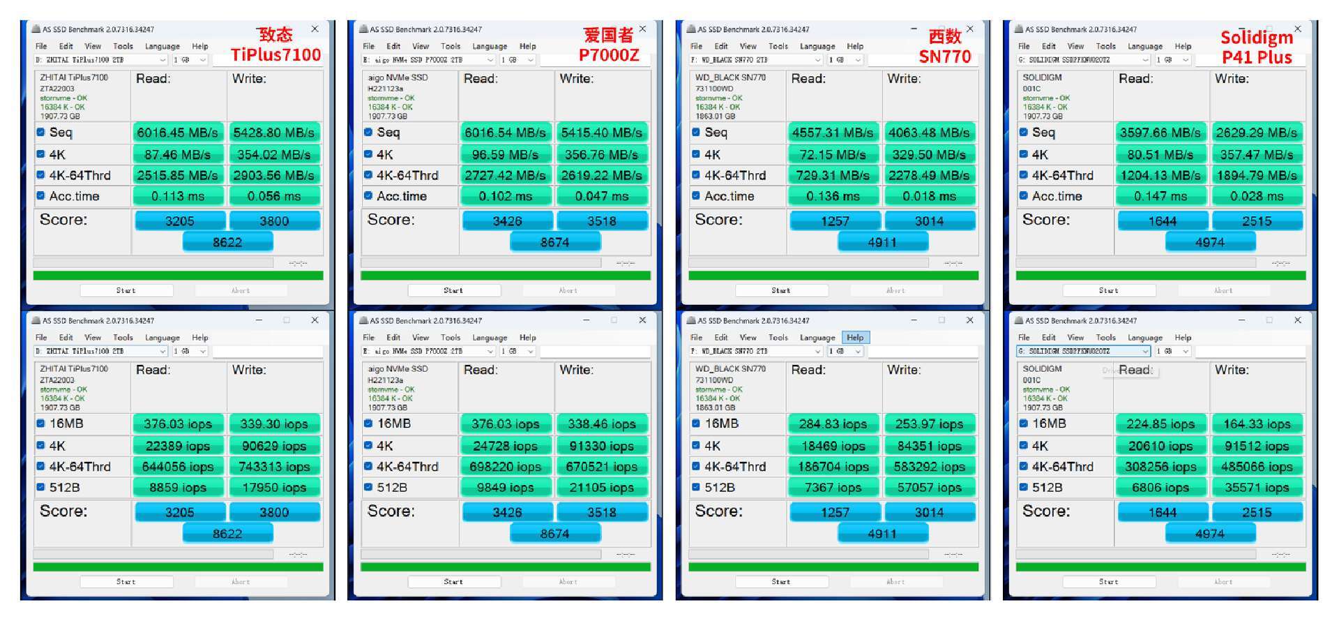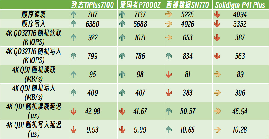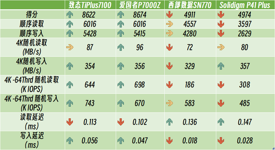 其中爱国者P7000Z在各项参数方面均为首位,超过了两块国外SSD的成绩,致态TiPlus7100的表现略逊一筹,不过差距也没有太大。