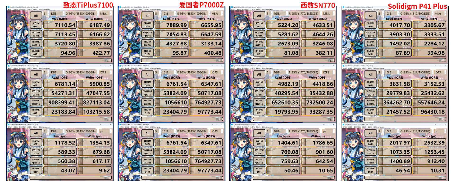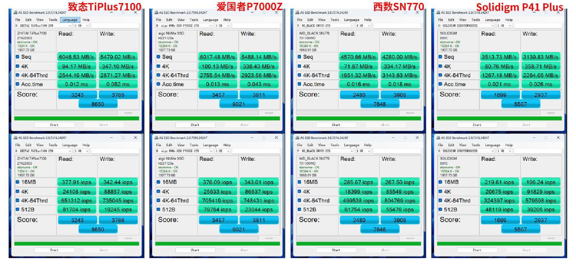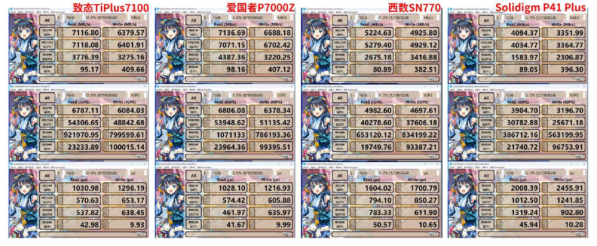 其中爱国者P7000Z在各项参数方面均为首位,超过了两块国外SSD的成绩,致态TiPlus7100的表现略逊一筹,不过差距也没有太大。
