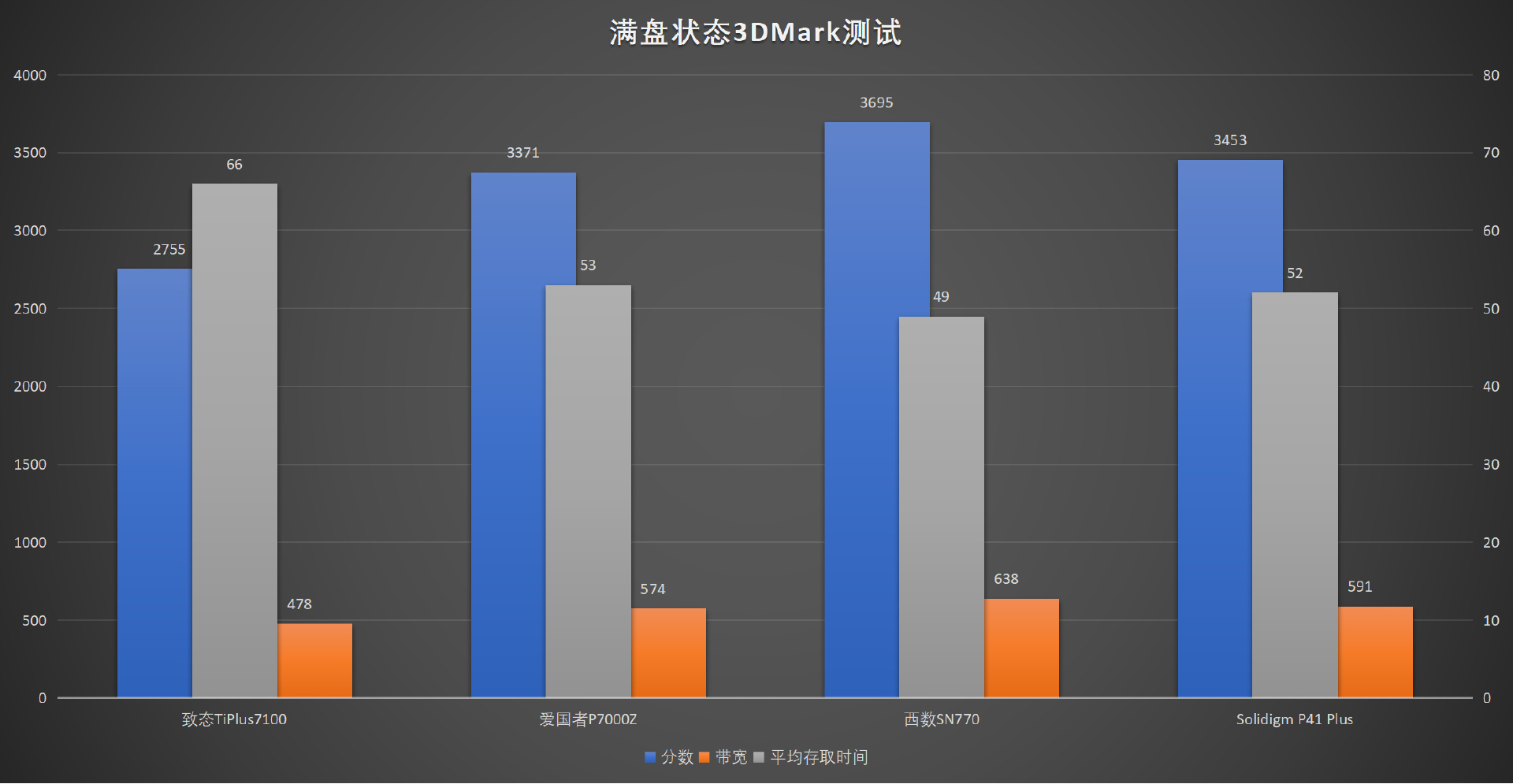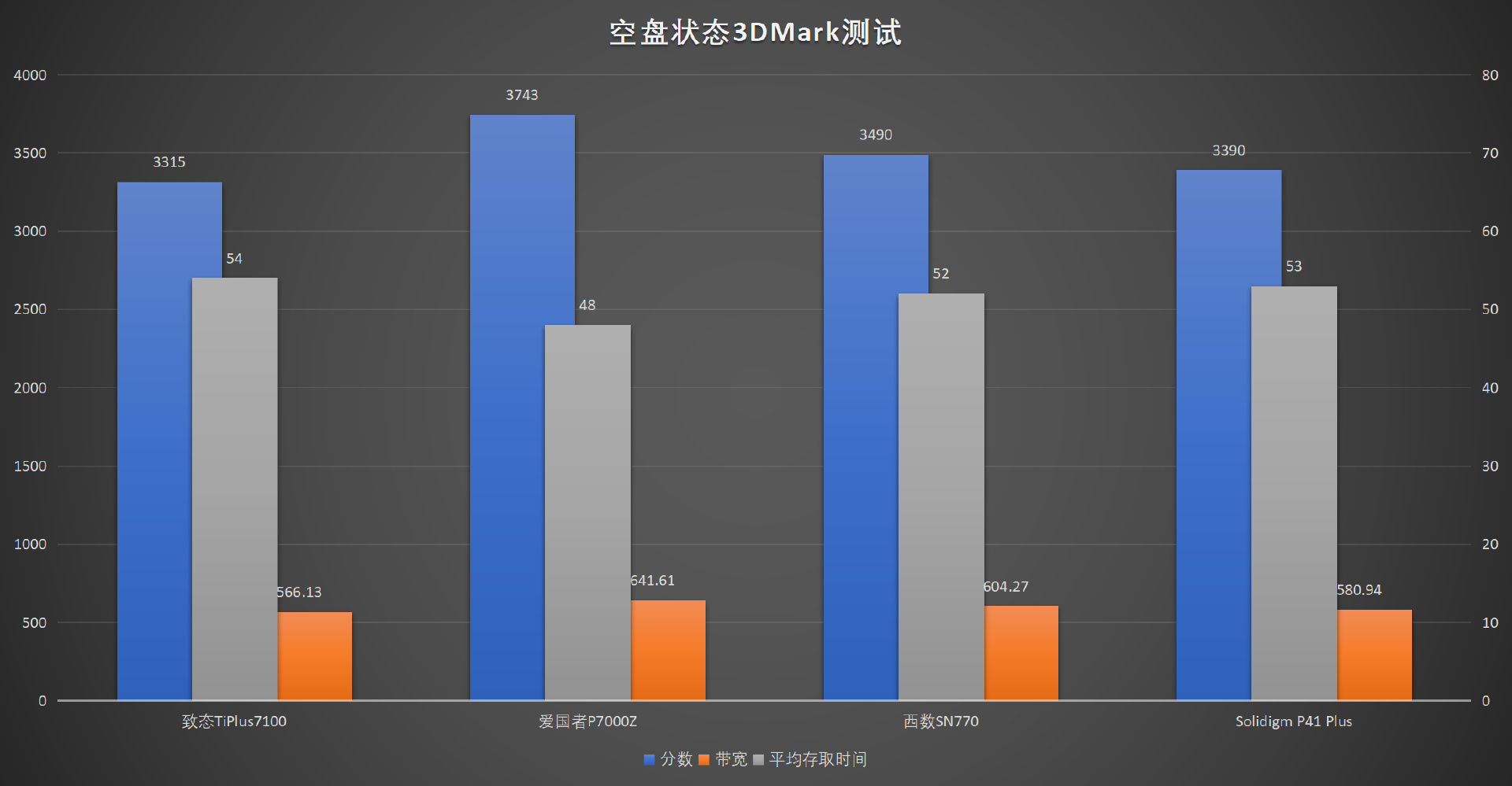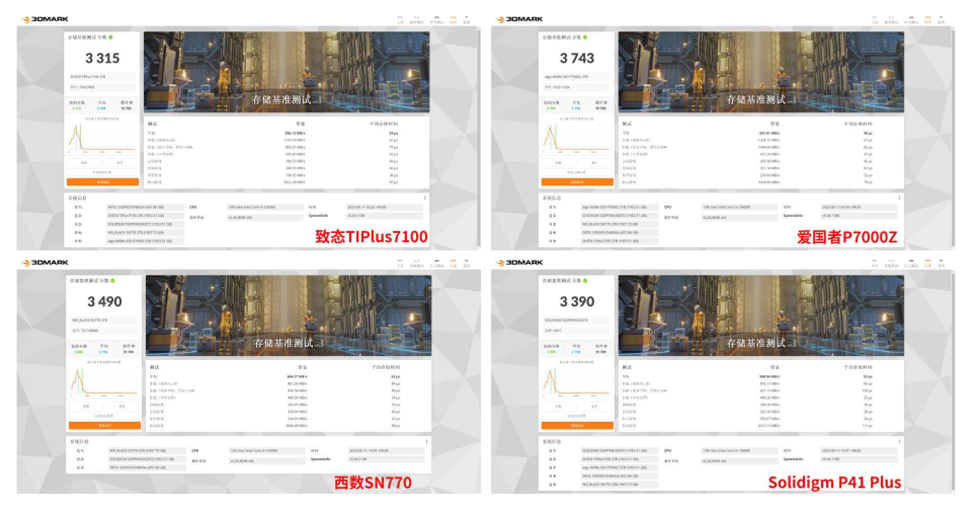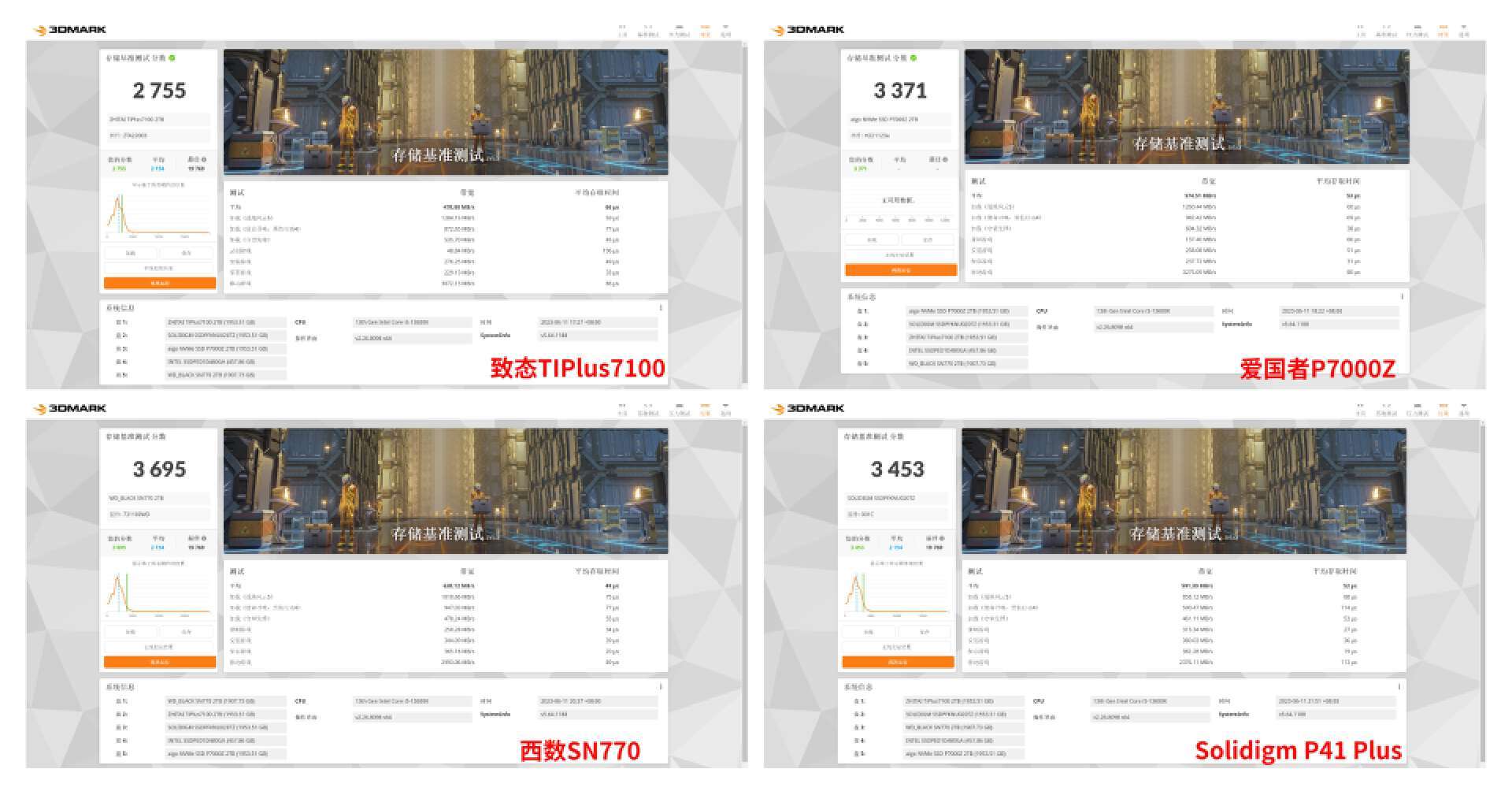 接下来用3DMark运行存储基准测试,空盘状态下,4款产品的测试结果表现如下: