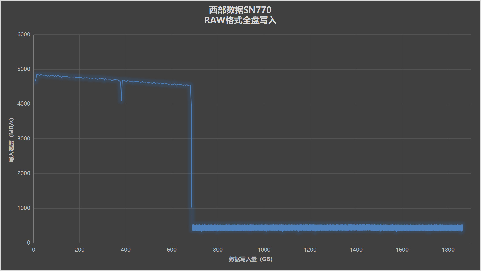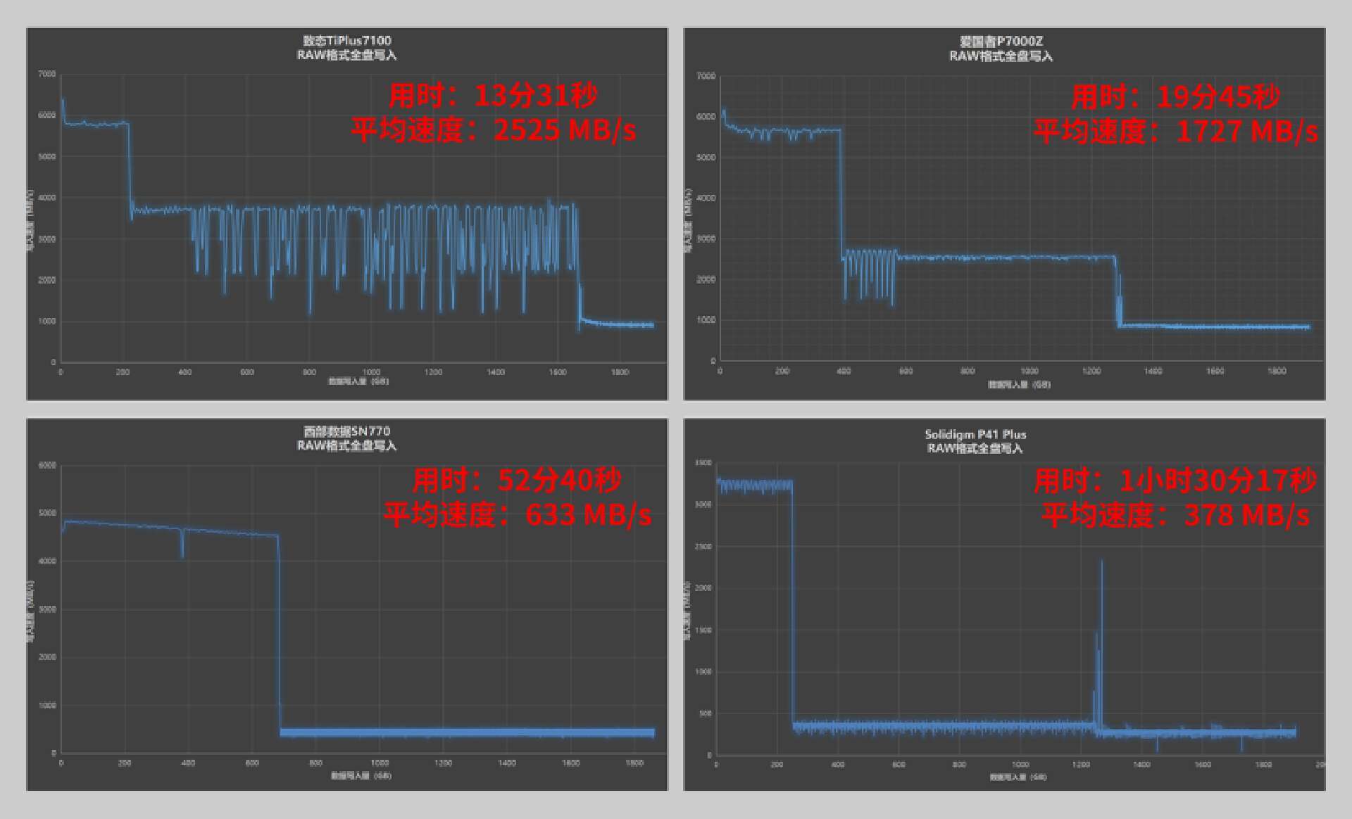 作为固态硬盘爱好者来说,只看基础测试的结果是远远不够的,还需要进行一些进阶测试来深入探索这块硬盘更全面的性能表现。毕竟还是有些朋友真的会有高负载大容量写入的需求的,所以这里对这4款SSD进行了RAW格式下的全盘顺序写入测试,以观察整体的写入性能和SLC Cache的方案。