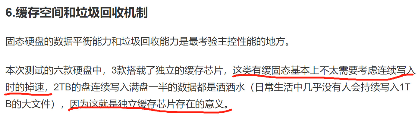 有缓盘与无缓盘的区别,其实就在于有无外置DRAM芯片而已。这里所说的DRAM缓存,与SLC Cache缓存,根本就不是一个东西。有些朋友会把这两个概念搞混,甚至还有专业的KOL作者都以自己的错误认识来指导新人,比如这种不负责任的说法: