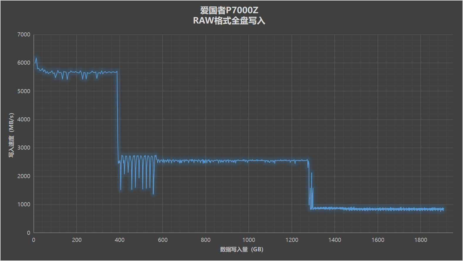 爱国者P7000Z则是和测过的其他国产SSD类似,全盘写入曲线呈现明显的三段式结构,并且在第二段TLC直写阶段的速度也很强,是我测过的国产SSD中的第一梯队,达到了2500MB/s;同时最慢的垃圾回收阶段也有900MB/s左右,相较于普通SSD 600MB/s的第三段速度,优势同样巨大。最终爱国者P7000Z的平均写入速度也达到了1727MB/s,非常优秀。