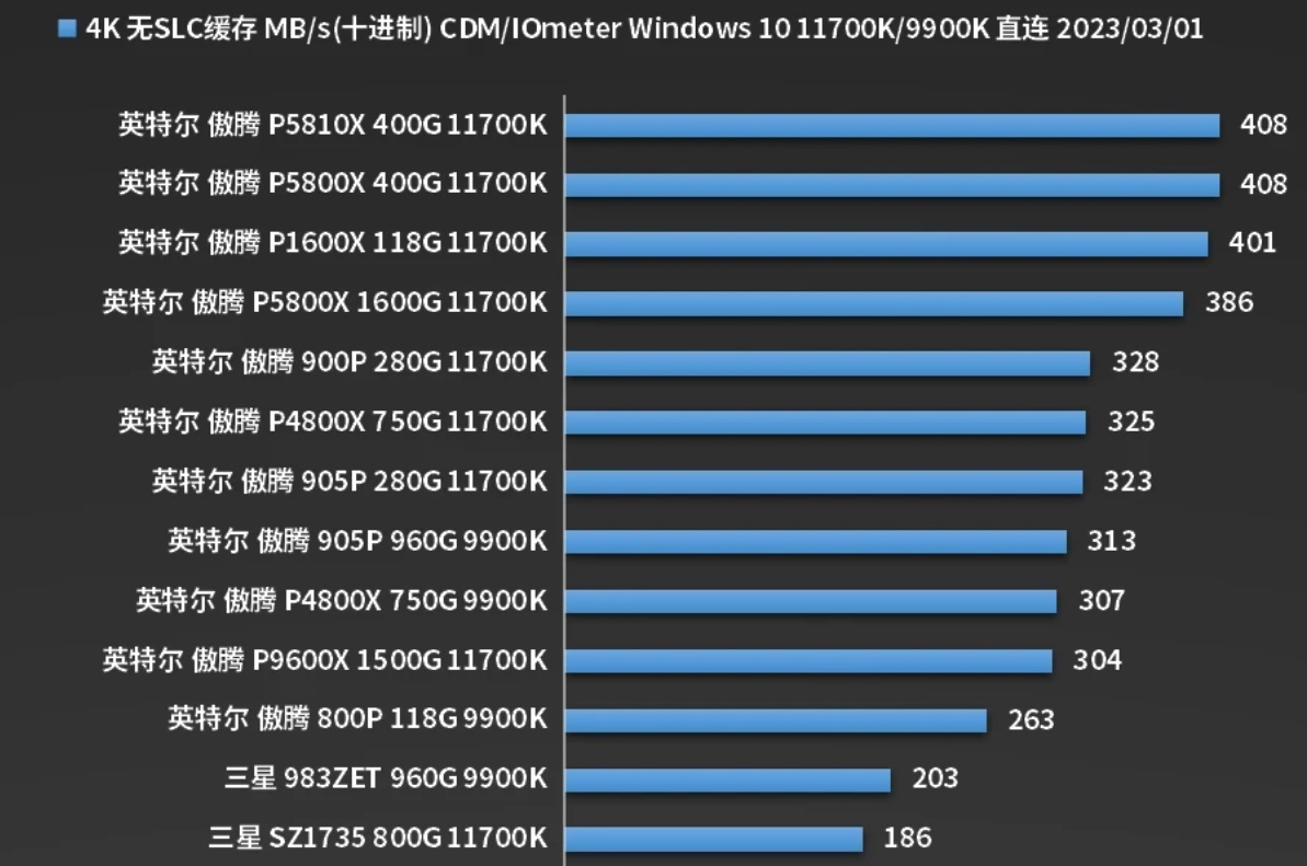 因为在SLC SSD以上,还有Intel的黑科技——使用3D Xpoint的傲腾固态硬盘存在,根本没有什么缓外缓内的概念,即使满盘写入也不会掉速,4K随机读取性能天生就是300MB/s,同时读写延迟还要低得多: