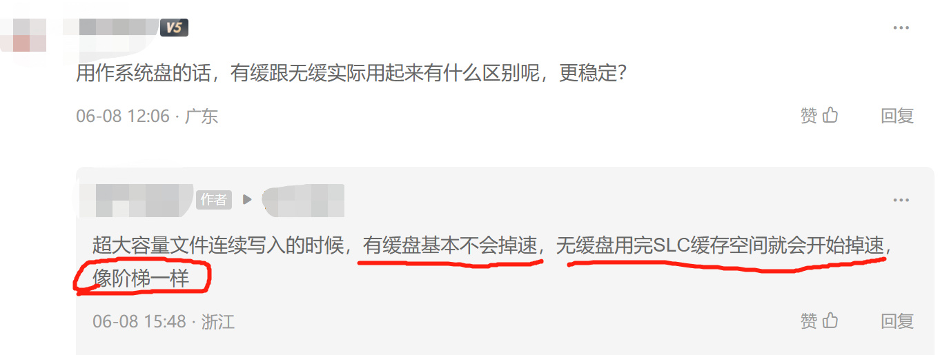 还有这种搞笑言论,明显是根本不知道有缓盘说的这个“缓”到底是什么,说得就好像有缓盘不用SLC Cache方案不会掉速一样,把小白忽悠得一愣一愣的: