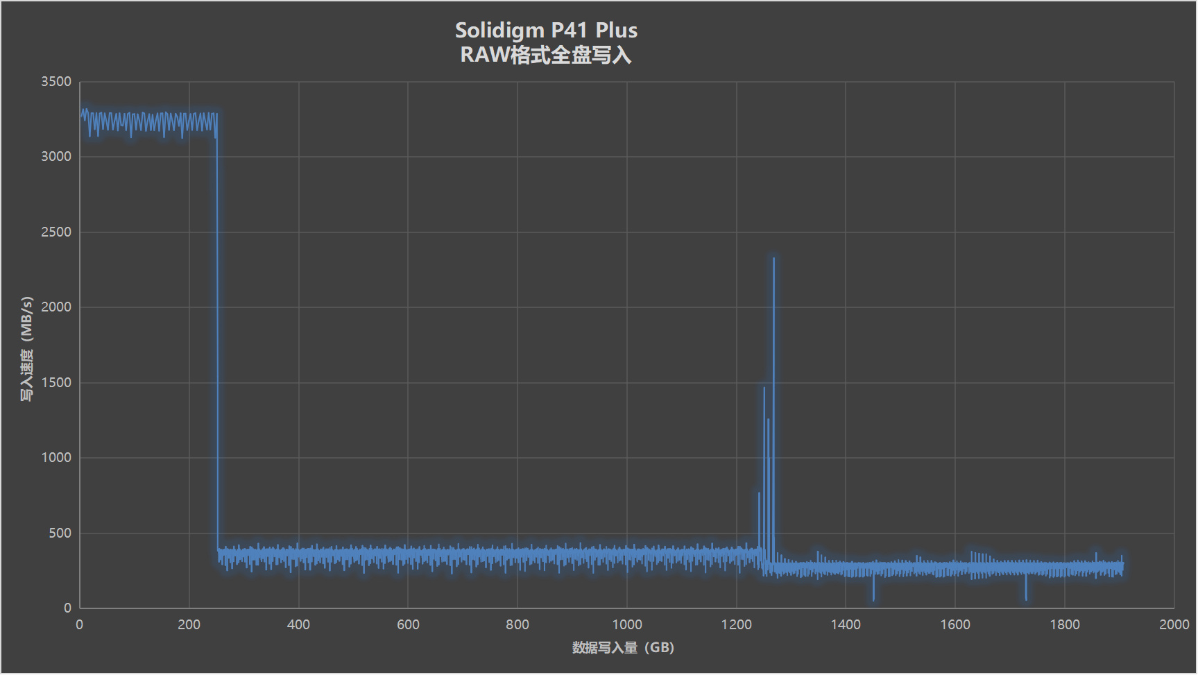 而Solidigm P41 Plus虽然没有使用全盘模拟SLC方案,缓内写入性能是没问题的,但是QLC颗粒的直写性能还不如SN770的垃圾回收阶段,出缓后的QLC直写速度只有400MB/s不到,进入第三段垃圾回收阶段时,速度更是降到了平均不足300MB/s。怎么形容呢……就是那种再不加油就要被机械硬盘追上了的感觉。