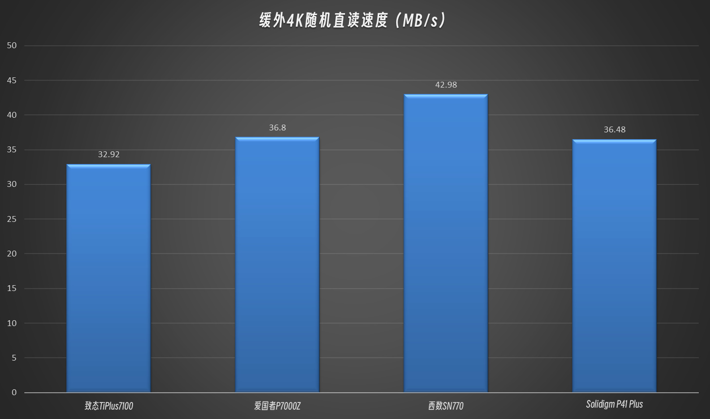可以发现,NVMe SSD的缓内4K随机读取性能虽然动辄高达90多MB/s,但是缓外的随机读取性能并没有那么高,致态TiPlus7100在这个项目中略逊一筹,好在爱国者P7000Z有所提升,与Solidigm P41 Plus拉平了。