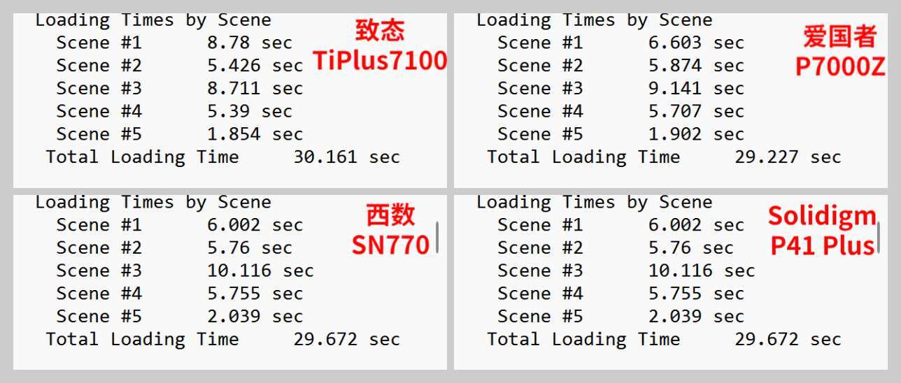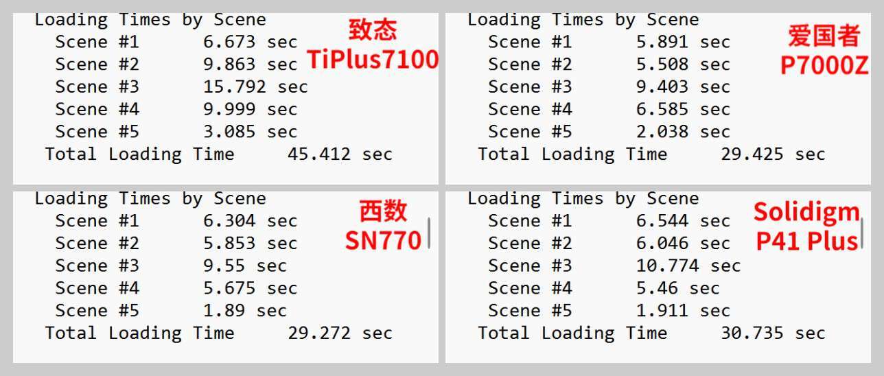 满盘状态下,四款SSD不仅在载入时长方面相差无几,并且和空盘状态下也基本一致,所以大家基本上不用担心在高占用情况下是否会影响游戏载入了,并且在这种实际应用的场景中,国产SSD和国外SSD也没啥区别。