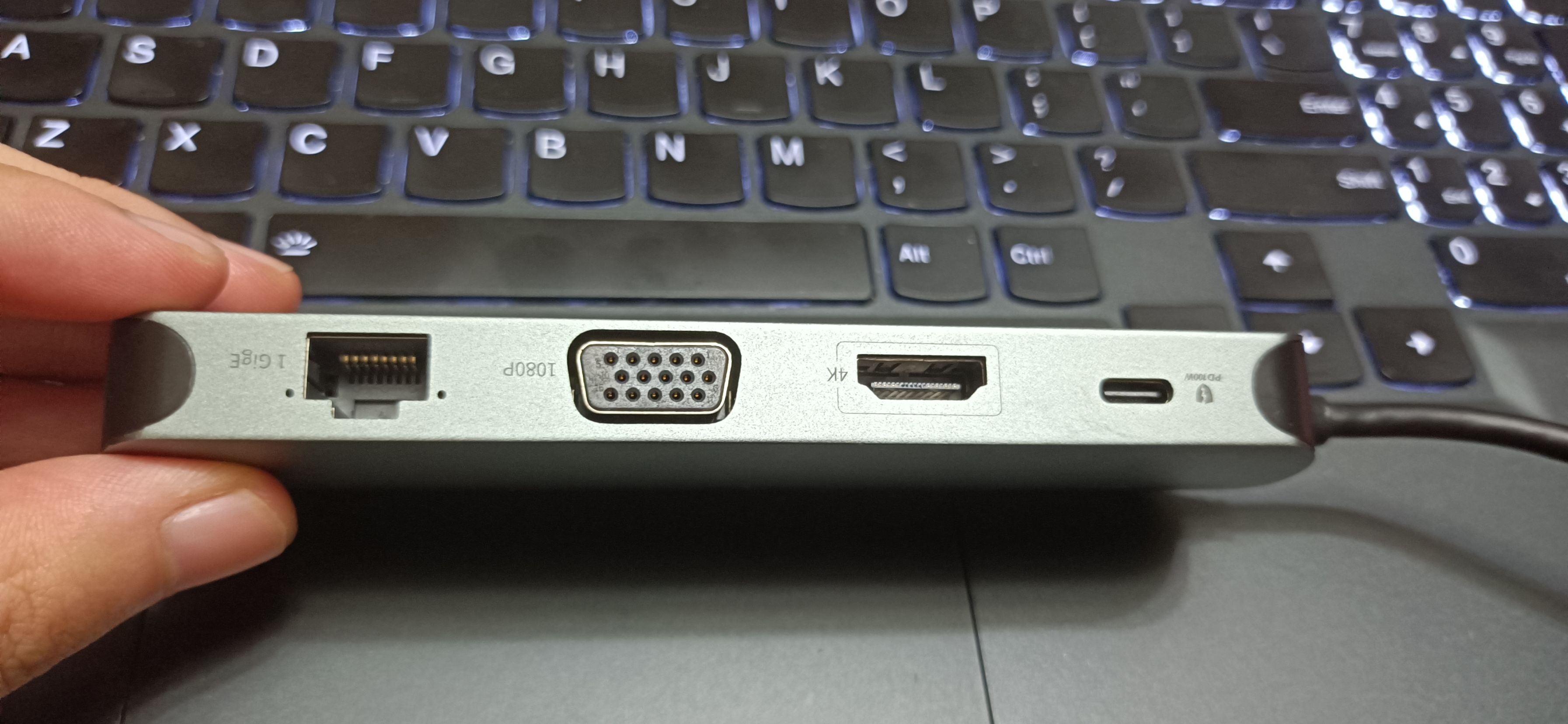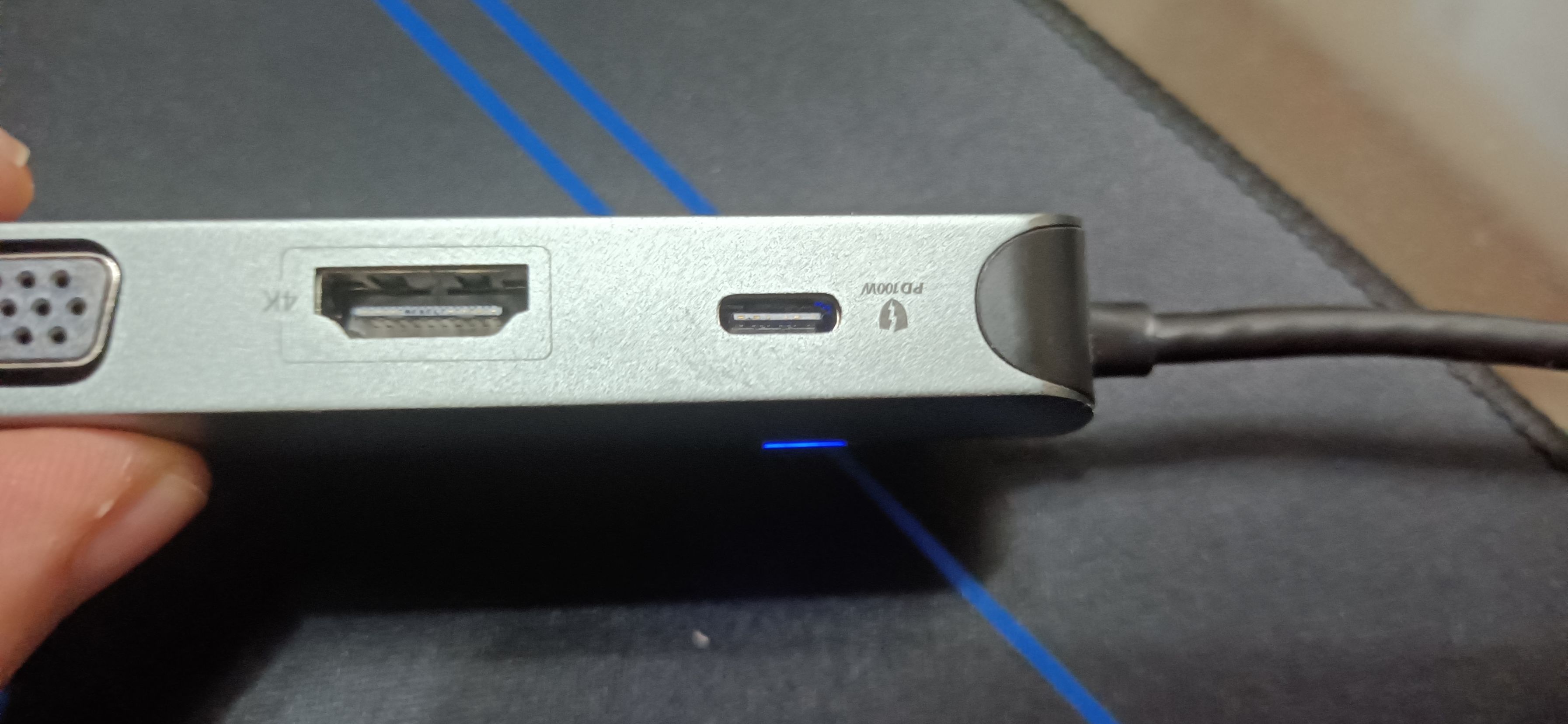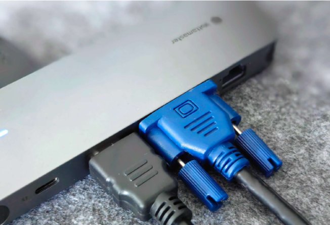 拓展坞支持的插口非常多,而且各功能非常多。左侧最上面是1个100wpd的typec充电接口,1个HDMI插口,1个古老的vga插口,1个支持千兆的网线插口;右侧最上面是1个3.5mm的耳机接口,3个usb3.0的插口,一个sd卡槽和1个tf卡槽竖直分列最后。一共10个口,7种不同功能任君选择。