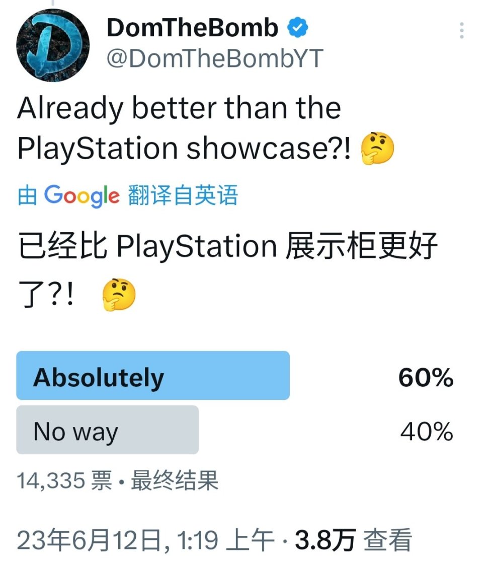 1,博主DomTheBombYT在推特发起了一场投票,xbox发布会是否超过了ps发布会?在14335次投票中,有60%的玩家感觉超过了ps发布会