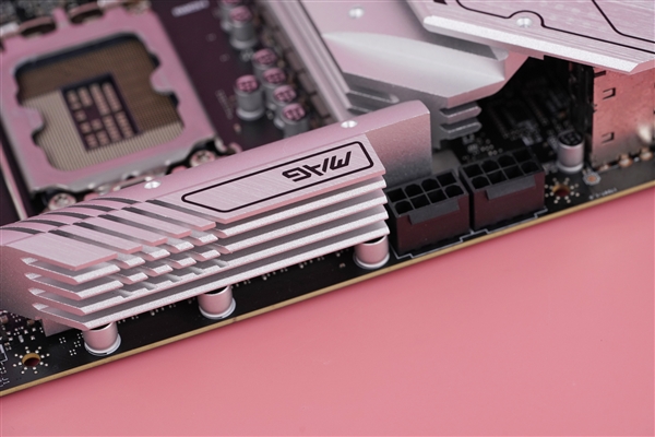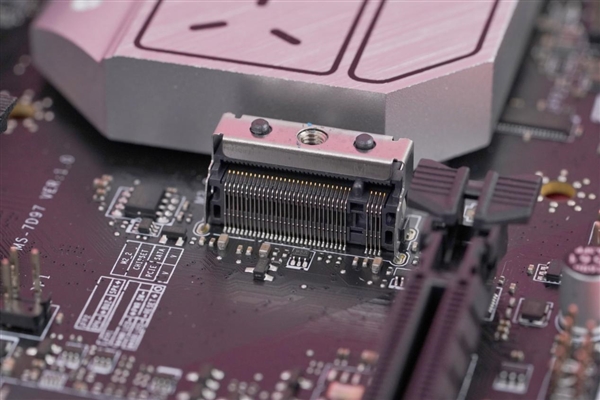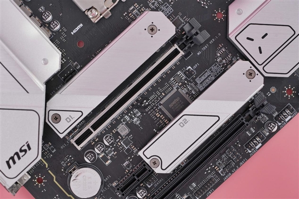與此同時,主板有兩根PCI-E x16插槽,其中有金屬裝甲包裹的是CPU提供的PCI-E 5.0 x16插槽。主板提供兩個M.2接口,均是PCI-E 4.0 x4的,而且都有散熱器覆蓋。