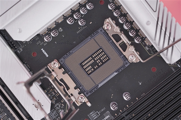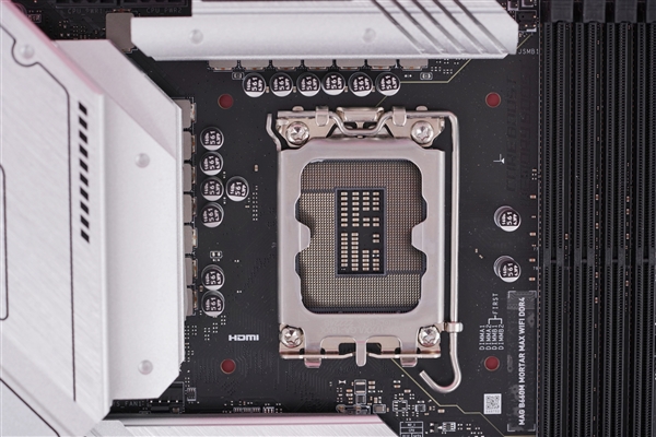接口方面,主板配備一體式I/O背板,這背板和旁邊的I/O散熱器一樣是白色的,這裏有一個USB 3.2 Gen2*2 Type-C口,三個USB 3.2 Gen 2,四個USB 2.0。視頻接口包括一個HDMI 2.1和一個DipsplayPort 1.4,均支持4K @60Hz的視頻輸出,5個3.5mm音頻接口和一個數字S/PDIF輸出。