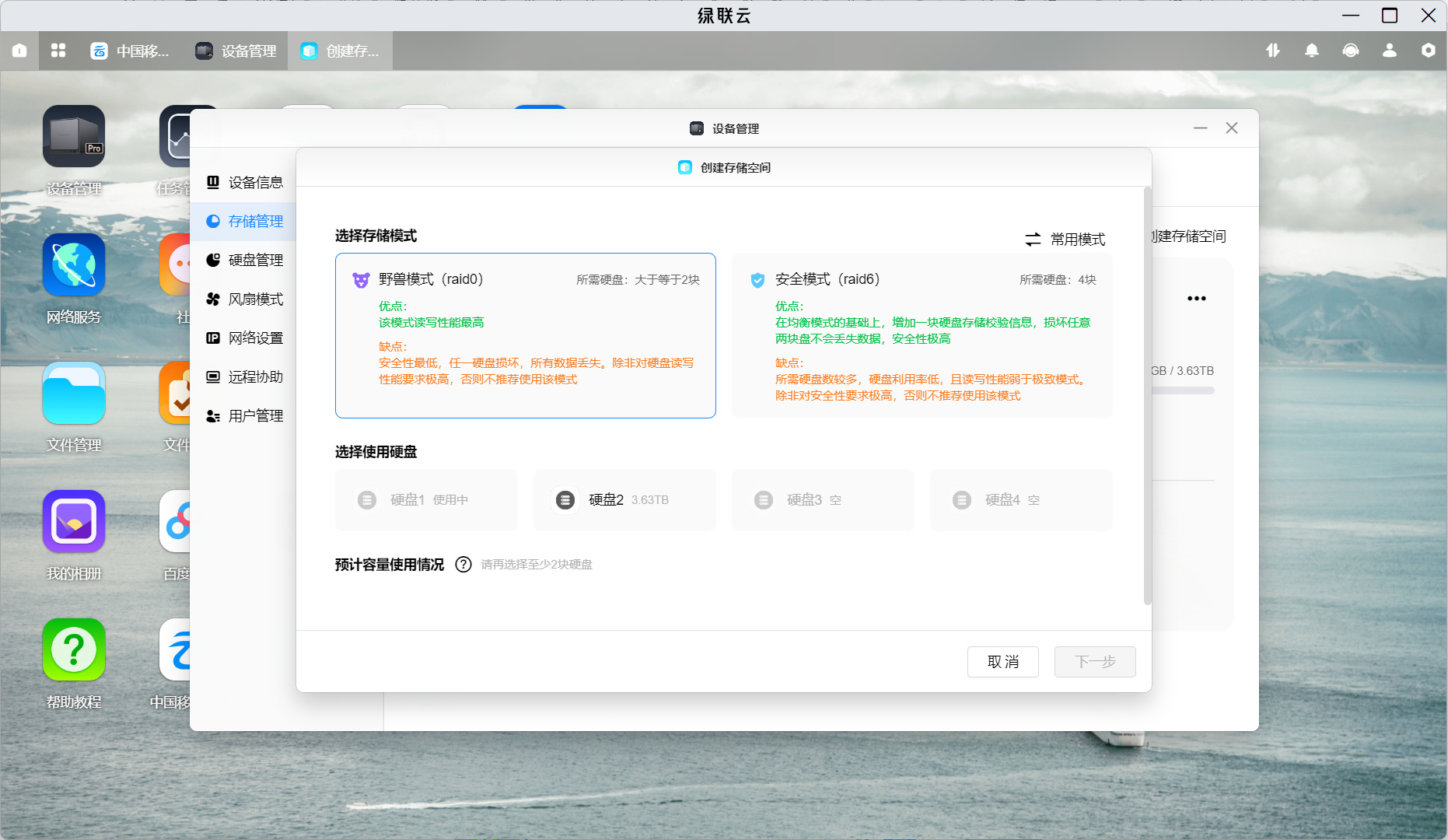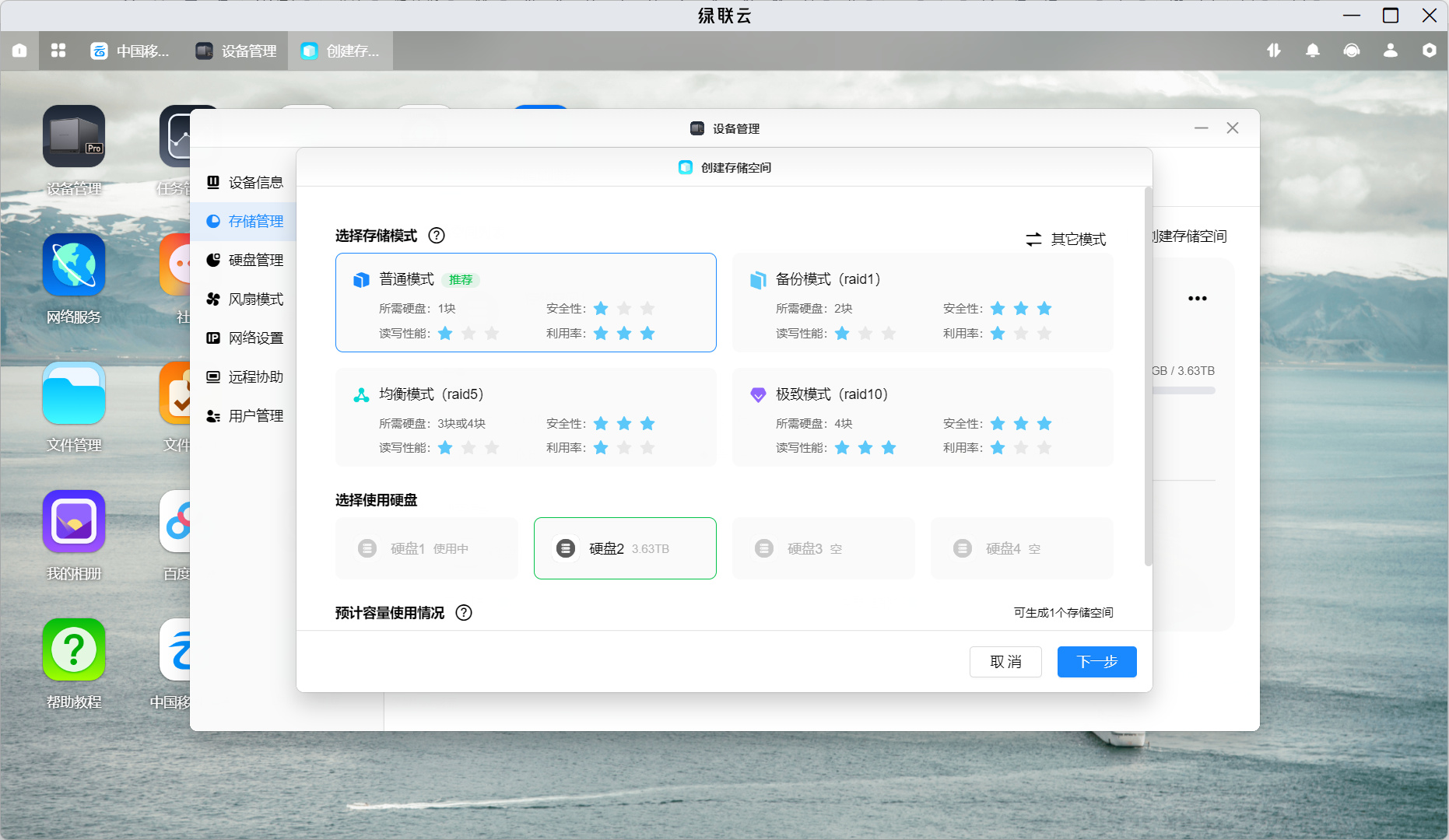 此外,绿联将NAS最基础的RAID功能做得非常好,非常齐全。在多硬盘下支持多个存储模式组合使用,提高了硬盘Raid模式的灵活度。比如:2个硬盘组成RAID1,2个硬盘组成RAID0;