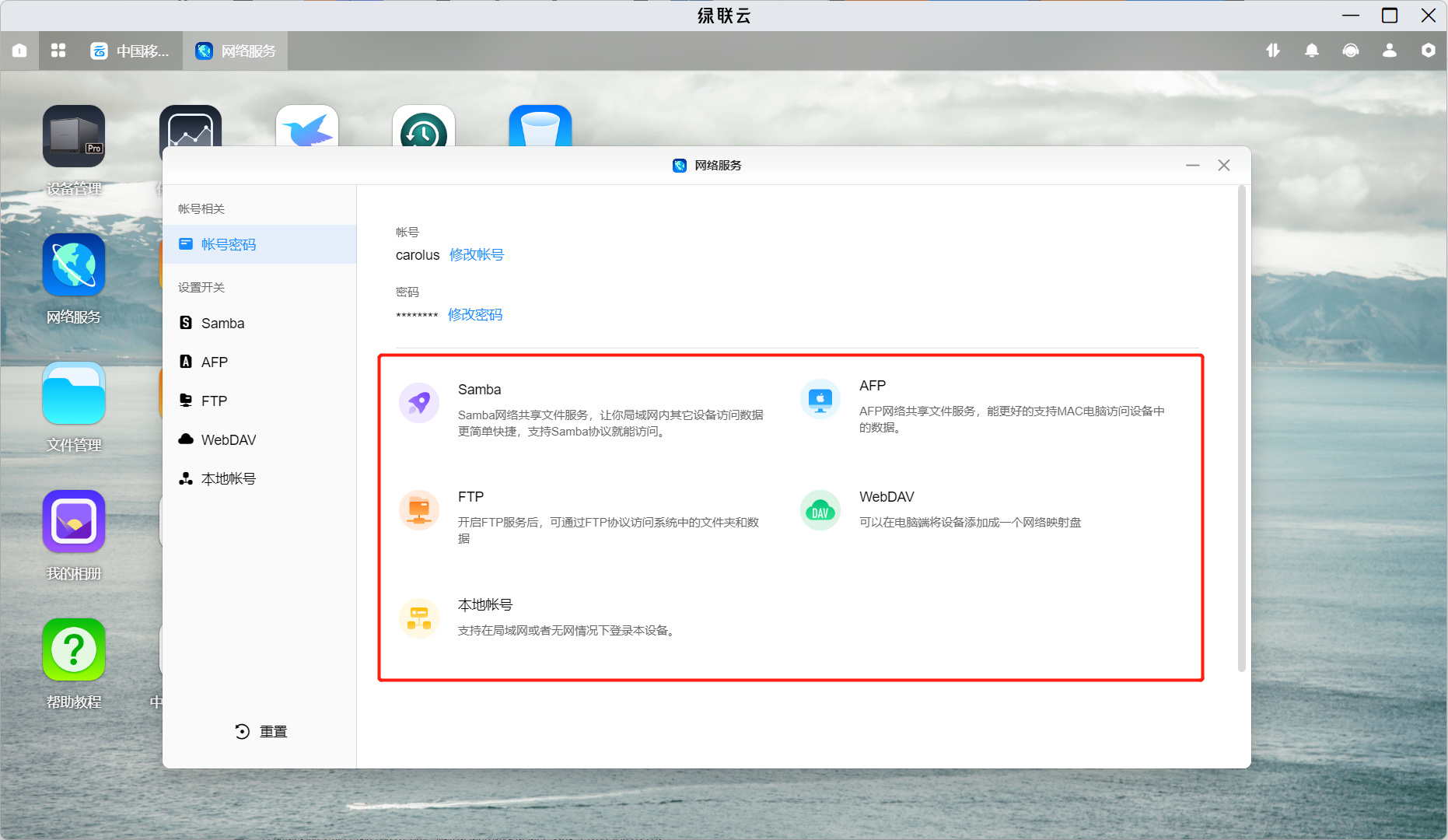 新手可能还在绿联云APP里面操作文件存储,但是老手绝对都是走的各种文件及网络共享协议。比如局域网的SMB、DLNA、AFP,外网的WebDav、FTP。只要用上了就不想再回去了。绿联的网络协议支持比较完善。