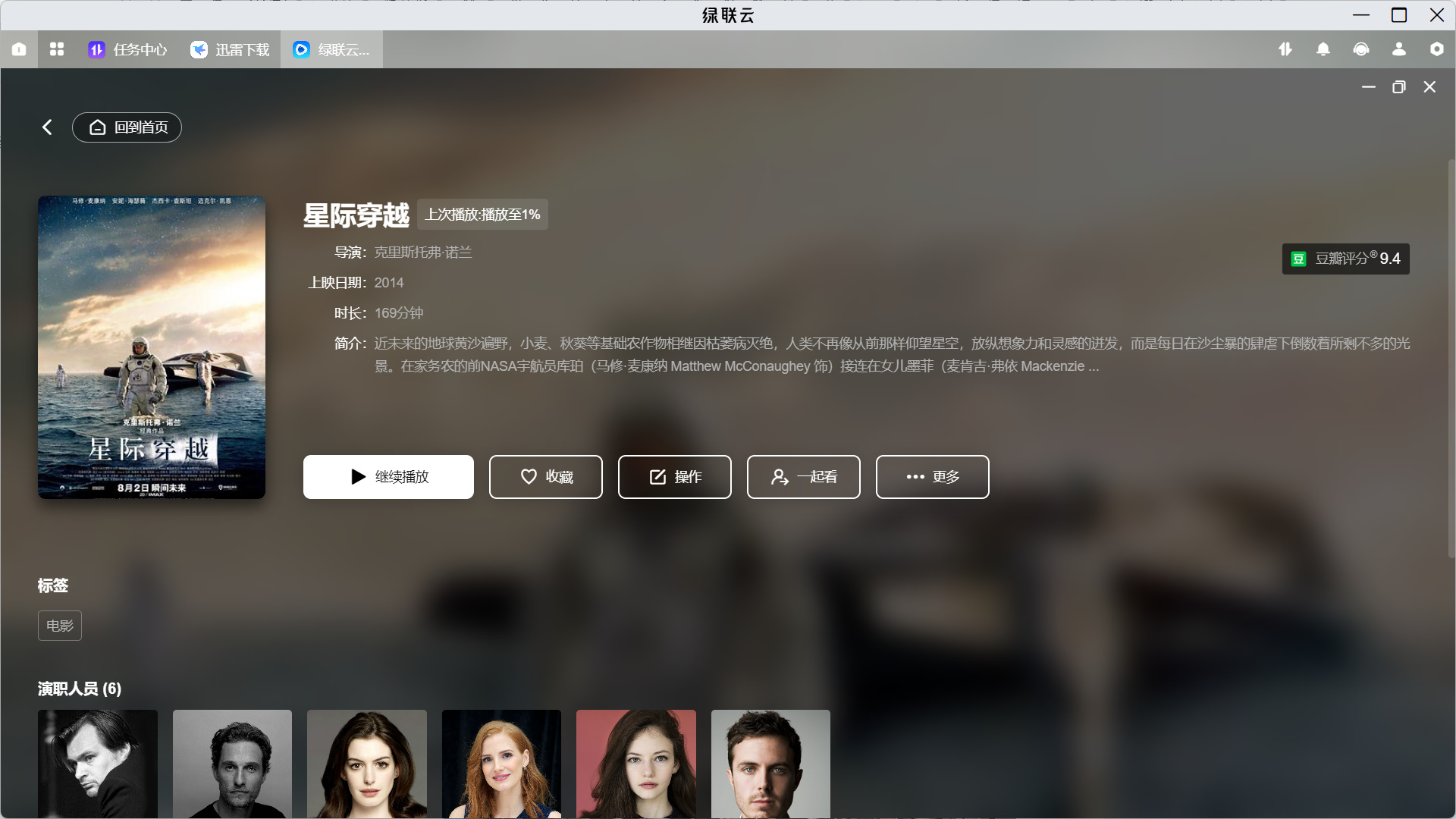 而在点进来也可以看到影片的详细信息,比如年份、简介、时长以及演员列表等等,同时他还会根据查询豆瓣评分等。它最近还出了一个新功能可以找好友一起看。