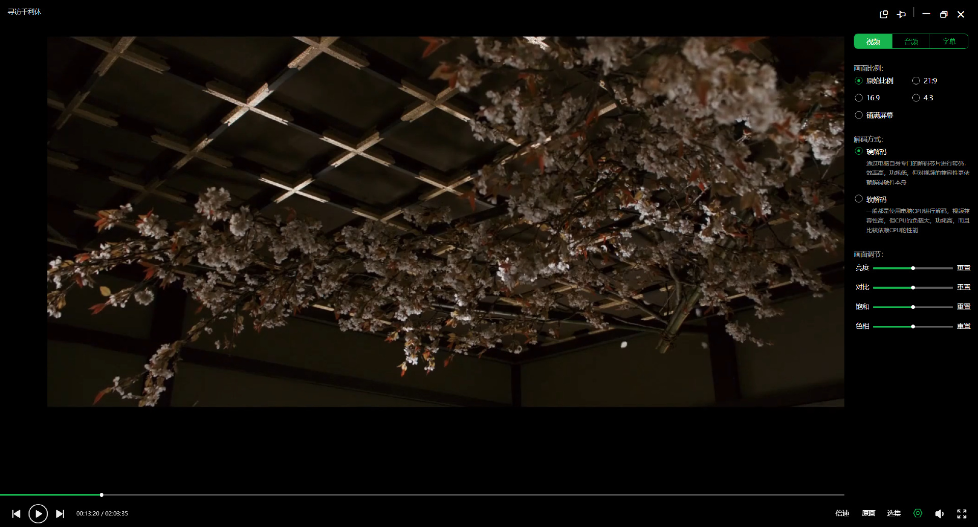 而在视频中,我们也可以看到有诸多设置选项。包括有视频比例,解码方式、音轨、字幕等。还可以针对画面调节进行针对性的调整,十分方便。