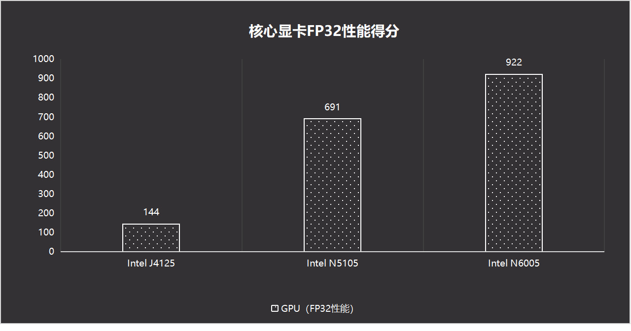 最后是显卡单精度浮点性能(FP32)测试,越高代表显卡性能越强。相比较N5105,Intel N6005集显性能提升33%;相比较与J4125,Intel N6005集显性能提升至640%。集显性能提升过于恐怖了!