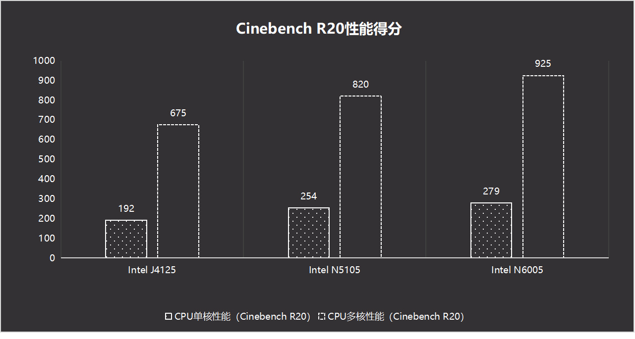 首先是Cinebench R20测试,这是一个CPU性能测试工具,可以看到绿联DX4600 Pro采用Intel N6005处理器是所有里面最强的。相比较N5105,多核性能提升13%,单核提升10%;相比较与J4125,多核性能提升37%,单核性能提升45%。