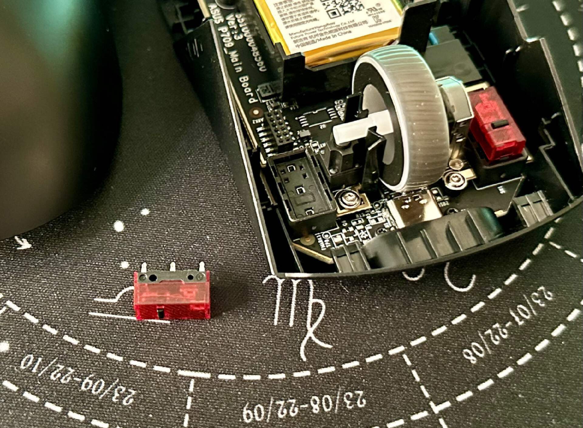 不支持微动热插拔,ROG自研微动,点击寿命可以到7000万次,增强化的镀金触点,压力偏差降低30%,压力值要比GPW的微动更高一些,点击馈感明显。