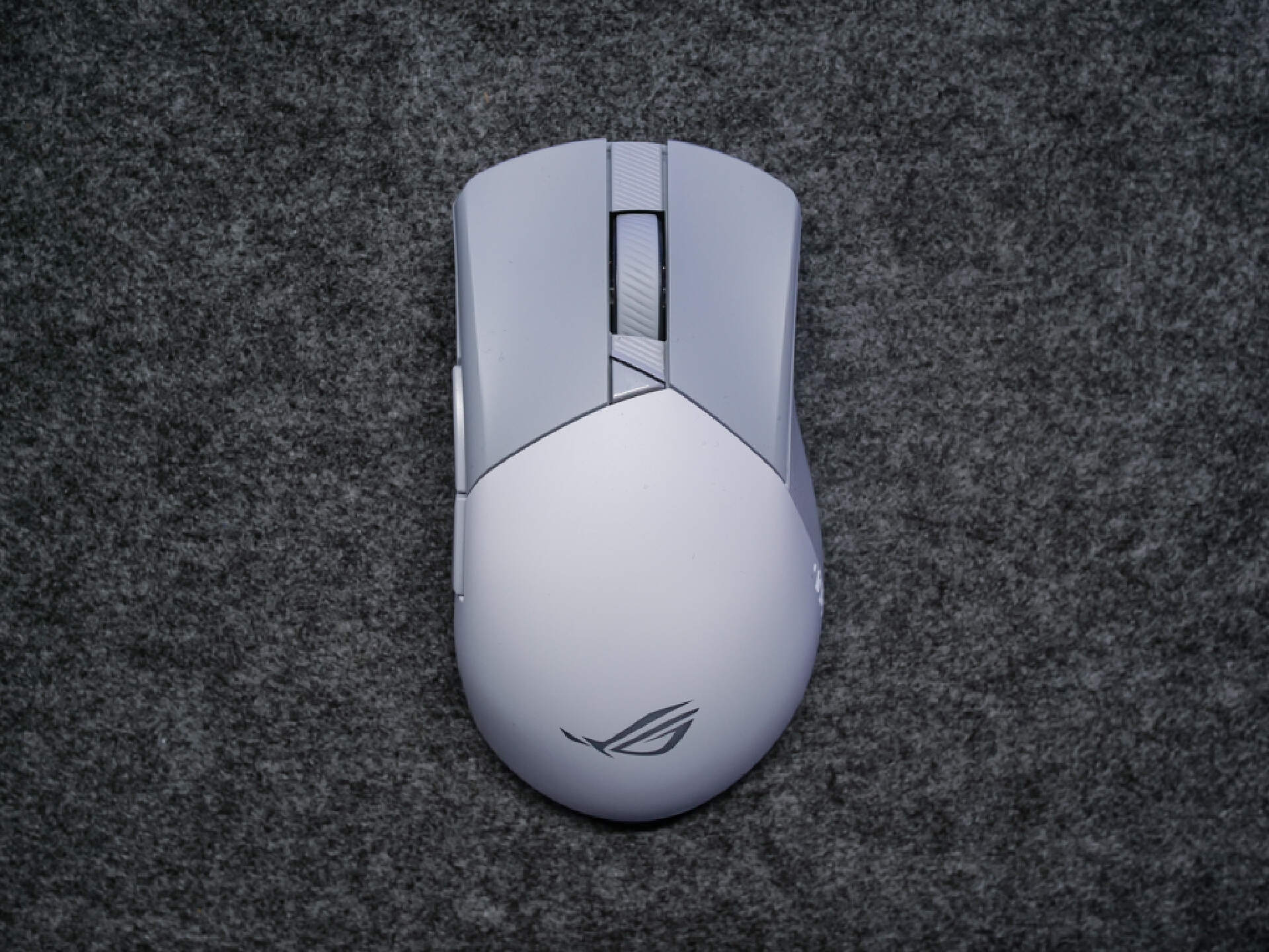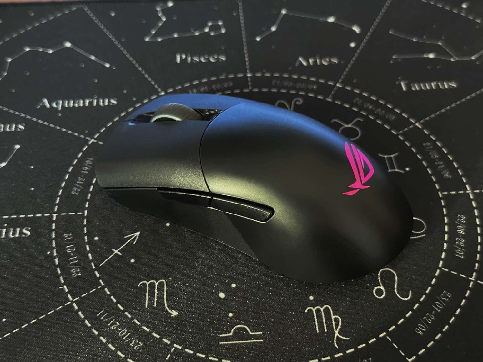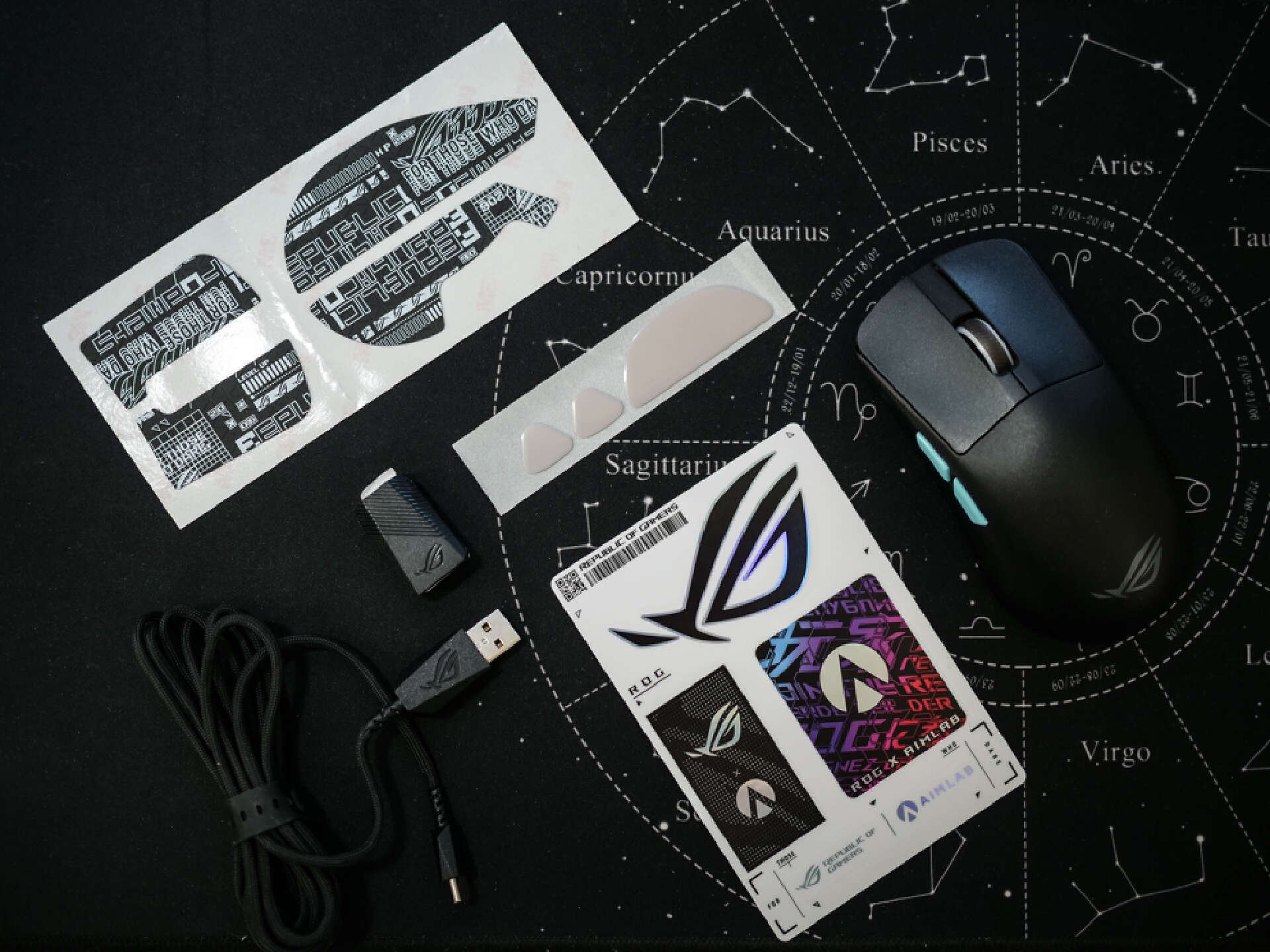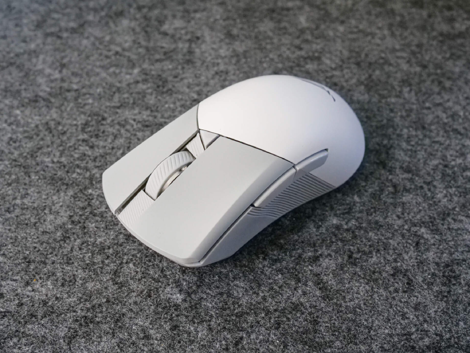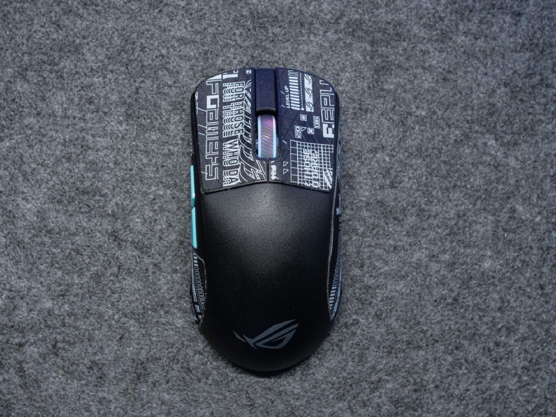 目前个人在用款,54g轻量化设计,127.5mm*63.7mm*39.6mm的尺寸,对称式设计,我中等手掌从GPW换过来基本没有不适感,趴握使用下按键部位跟手指更贴合,搭配ROG鼠标标配的图腾贴纸,手感要更好一些。