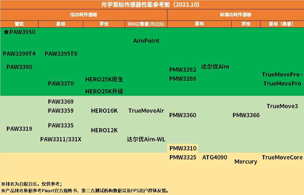 除了尺寸、设计、重量,鼠标的性能主要还是取决于光学传感器的灵敏度,一般用分辨率DPI来衡量,上面这张图是网友整理的鼠标光学传感器天梯图,基本是原相PAW一家独霸,基本上主流厂商不是直接使用原相公版传感器,就是跟原相合作定制专属传感器。