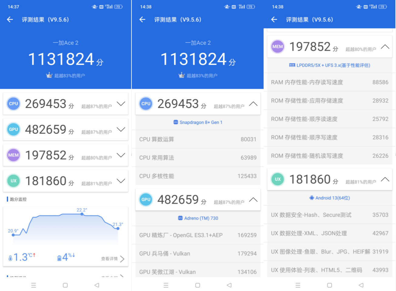 一加ace2手机安兔兔跑分高达113万,由于使用了满血版第一代骁龙8+处理器,在跑分上面一点点不含糊,这就意味着在大型游戏的环境中有着更好的使用体验。当然这还得益于一加Ace2的16G大内存,它最多支持34个超多APP的同时运行,让你不再担心安卓手机的卡顿。