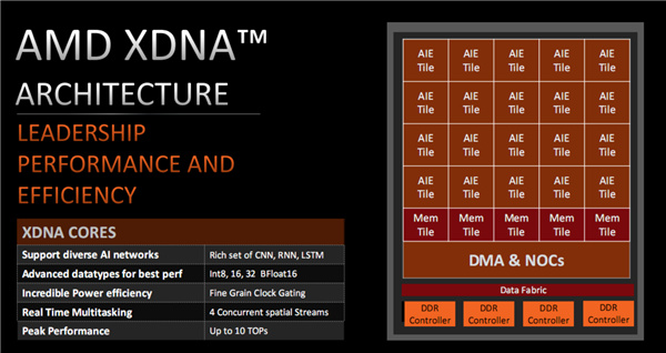 XDNA AI架构可以脱离云侧依赖,直接在本地无延迟地灵活处理不同的AI神经网络,包括CNN(卷积神经网络)、RNN(循环神经网络)、LSTM(时间递归神经网络)等,并支持INT8、FP16、FP32、BF16等各种数据类型,还具备实时多任务能力,可处理最多4条并发空间流。