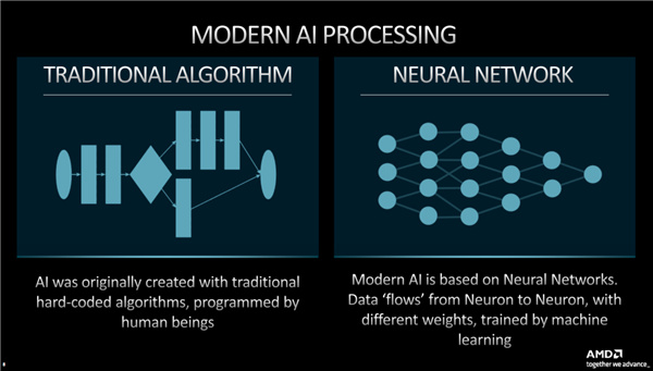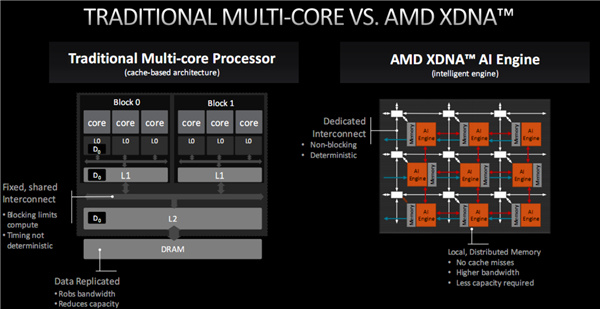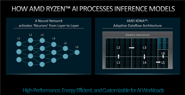 同时,AMD锐龙AI引擎改变了推理模型的处理方式,不再像传统神经网络那样,只能在多个“神经元”之间一层一层地逐次流动,而是采用了全新的适应性数据流架构和适应性互连。