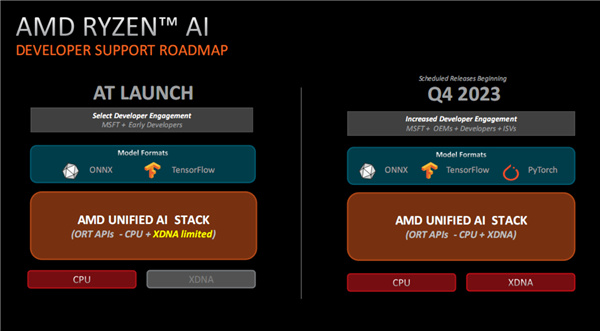 届时,一体化的AMD AI堆栈,可以综合利用CPU处理器、XDNA引擎的算力与能力,支持ONNX、TensorFlow、PyTorch等多种模型,微软、OEM厂商、ISV独立软件开发商、个人开发者都可以自由使用它们。
