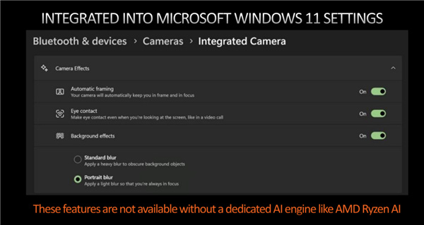 目前,AMD已经与微软联合做了大量工作,Windows 11系统正在逐步释放锐龙AI引擎的能力,并直接集成在系统设置中,使用方法异常简单。