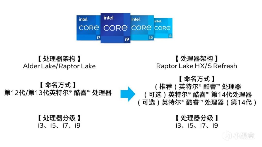 與此同時,延續Raptor Lake架構的HX、S處理器升級版本,則仍然會叫第14代酷睿,包含酷睿i3、酷睿i5、酷睿i7、酷睿i9: