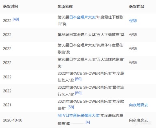 • 10月30日,憑藉歌曲《向夜晚奔去》獲得“MTV日本音樂錄像帶大獎”年度最優秀最歌曲獎