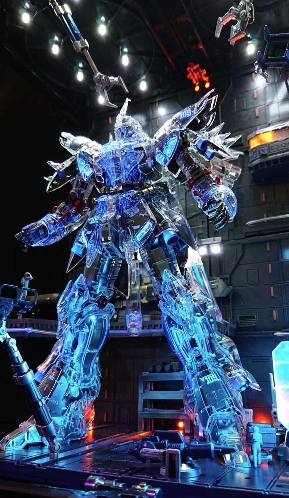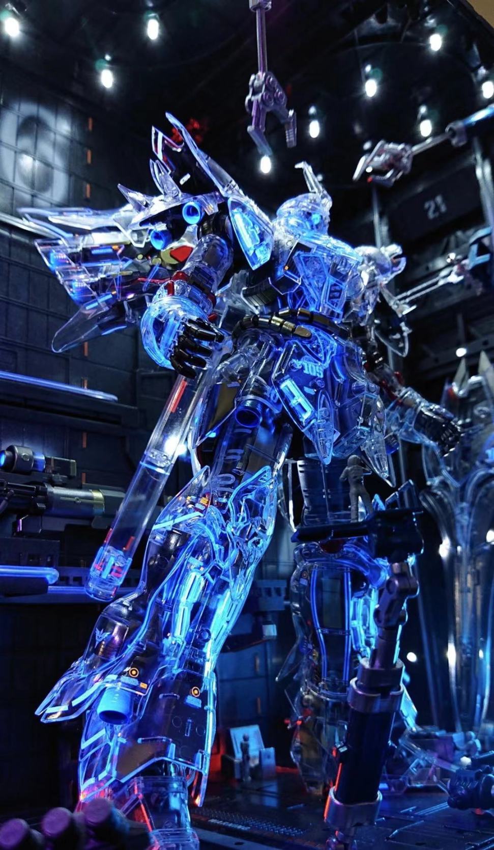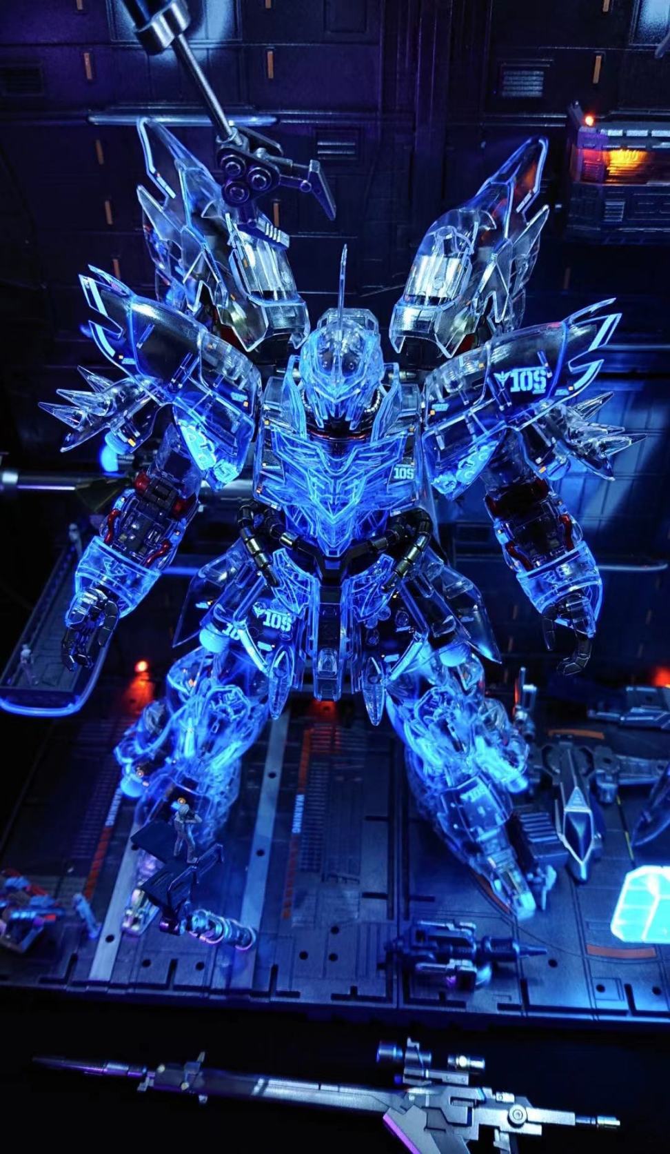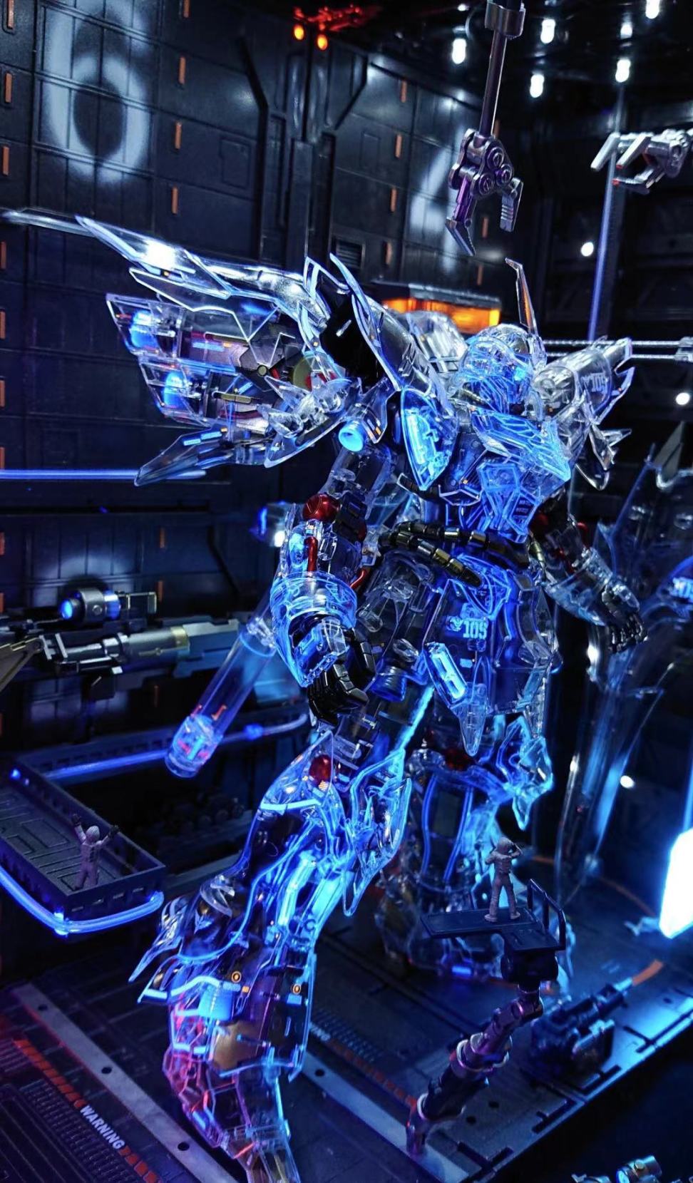 打上紫光之后的新安洲模型可以说是相当的酷炫,模友涂装的是偏蓝色的荧光漆,大家感觉这个配色怎么样呢?为了增加这款模型的美型度,模友还为其搭配了格纳库场景,搭配格纳库的荧光透明外甲新安洲模型变得更加的帅气了。