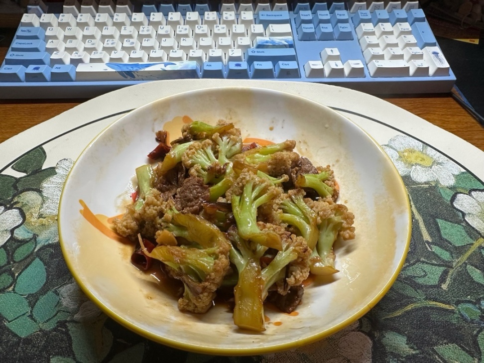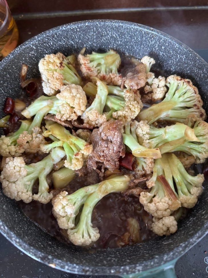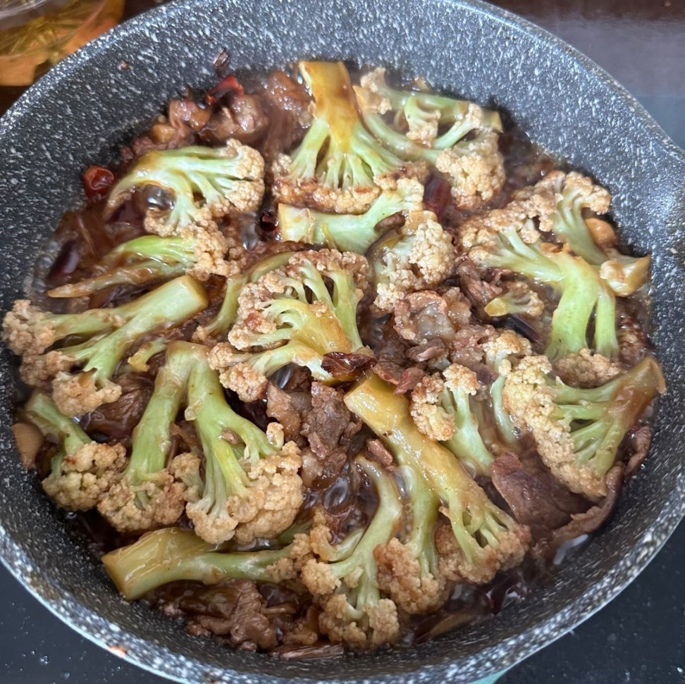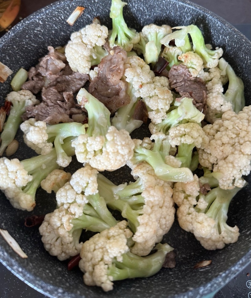 4.炒到菜花有点变色的时候加入牛肉继续翻炒,然后加入蚝油➕生抽➕老抽➕少许水