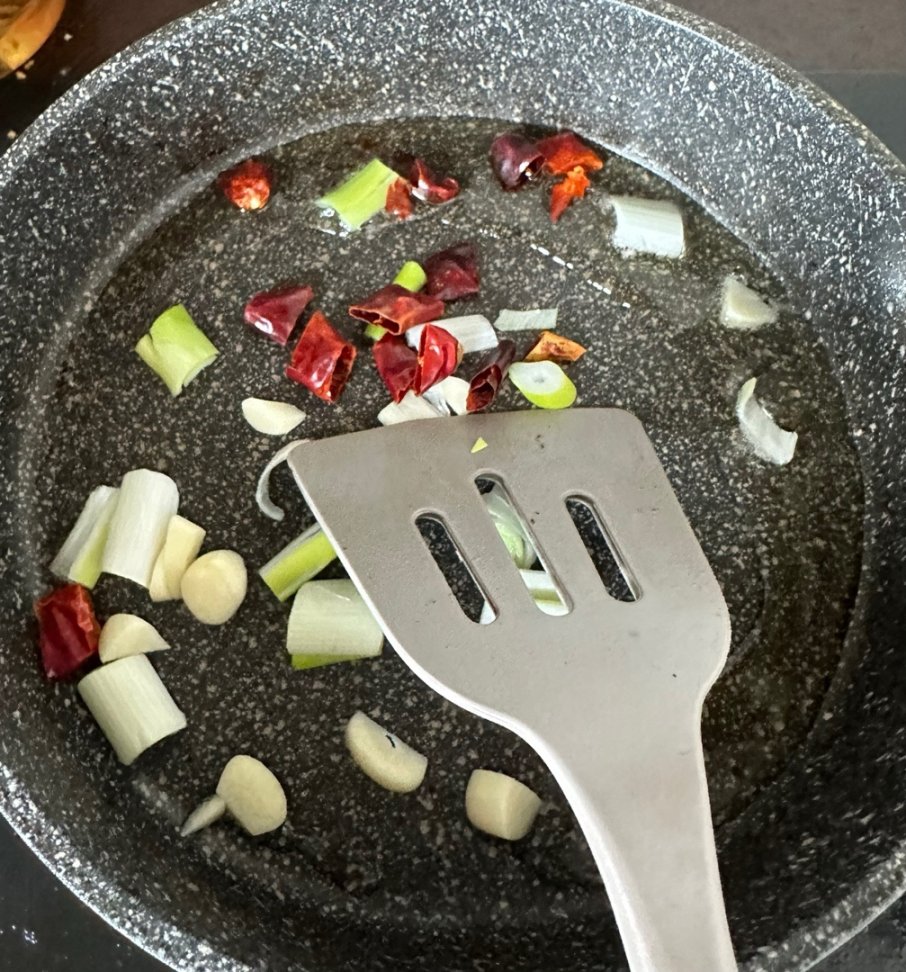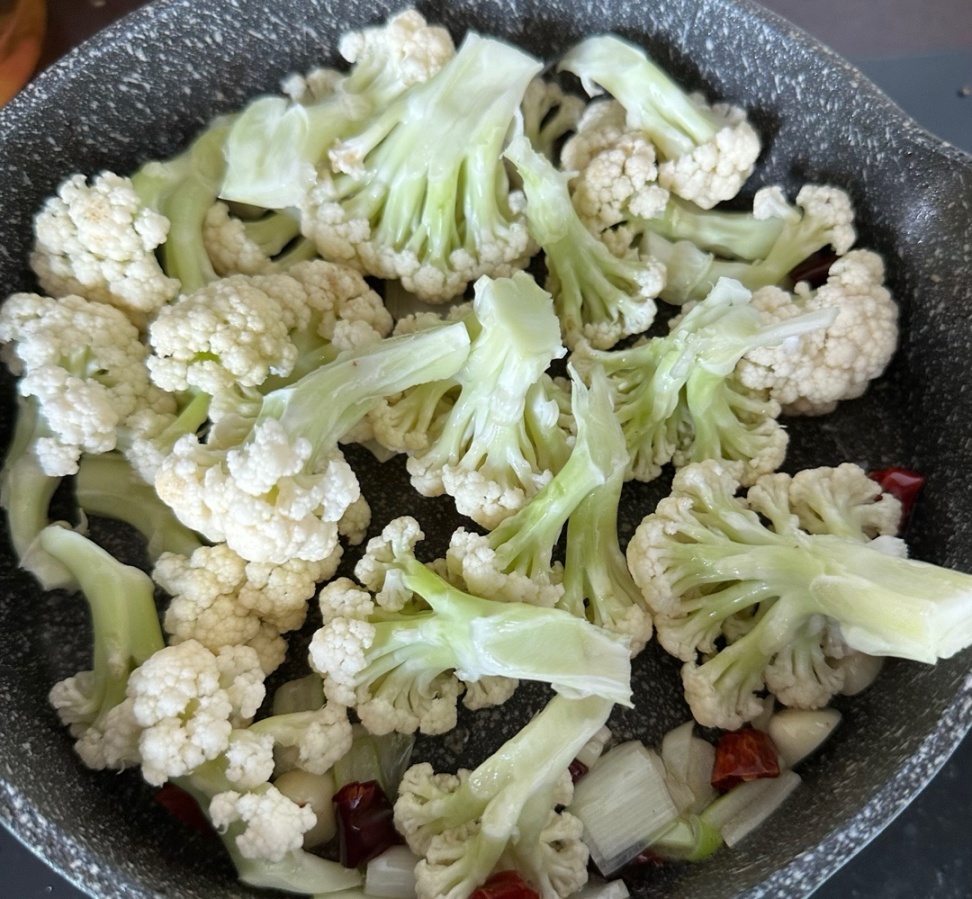 3.洗好菜后起锅烧油,加入葱蒜辣椒煸香,加入菜花翻炒