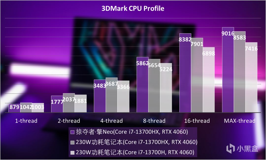 從3DMark CPU Profile測試中,可以看到Core i7-13700HX的性能釋放要比230W功耗筆記本高一些。