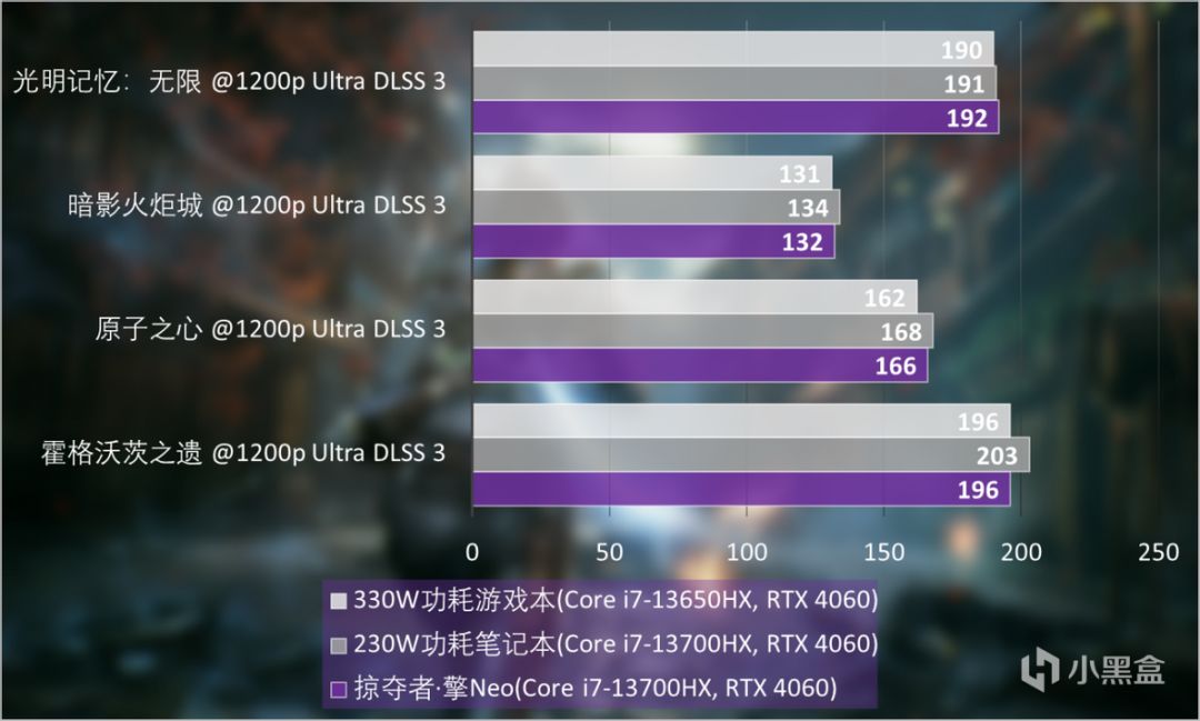 可以看到《霍格沃茨之遺》、《光明記憶:無限》在DLSS 3加持下,幀率已經接近200FPS。
