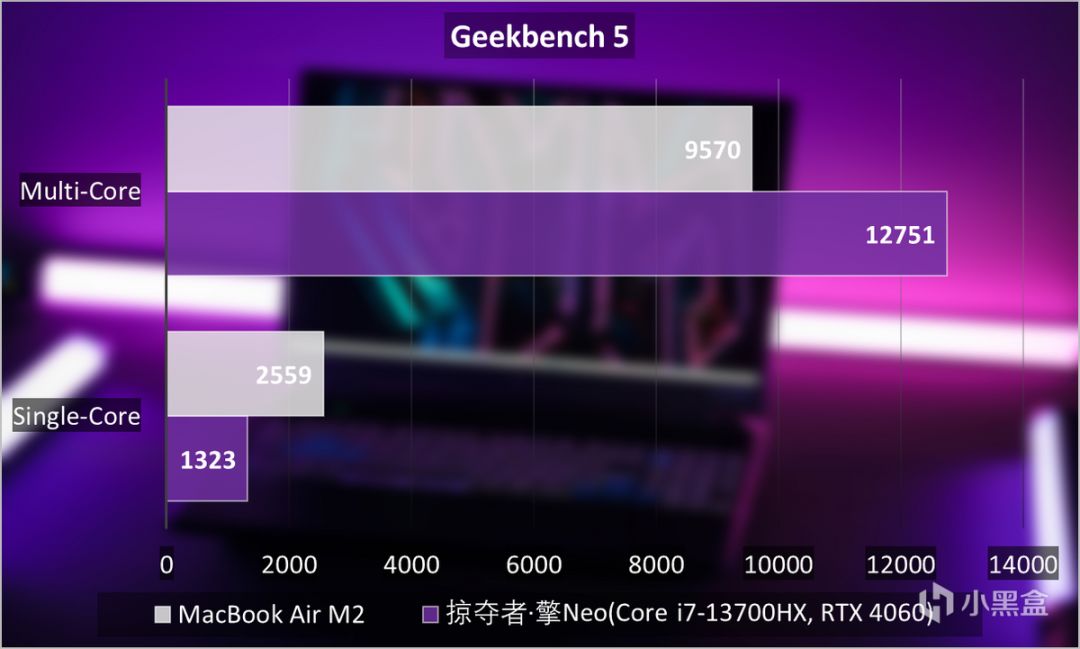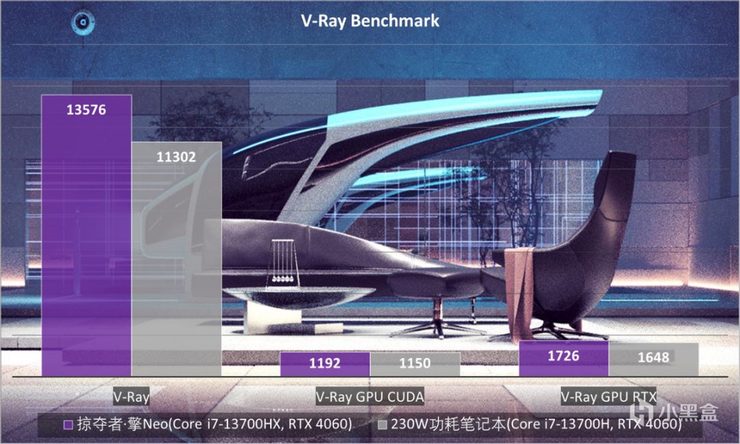 在一些內容創作的場景中,可以看到掠奪者·擎Neo也能有很好的表現。例如V-Ray 5 Benchmark測試主要考驗CPU的多線程性能,以及GPU的CUDA Core和光線追蹤性能。同樣是對比Core i7-13700H,掠奪者·擎Neo的Core i7-13700HX顯得更爲強勢不少。