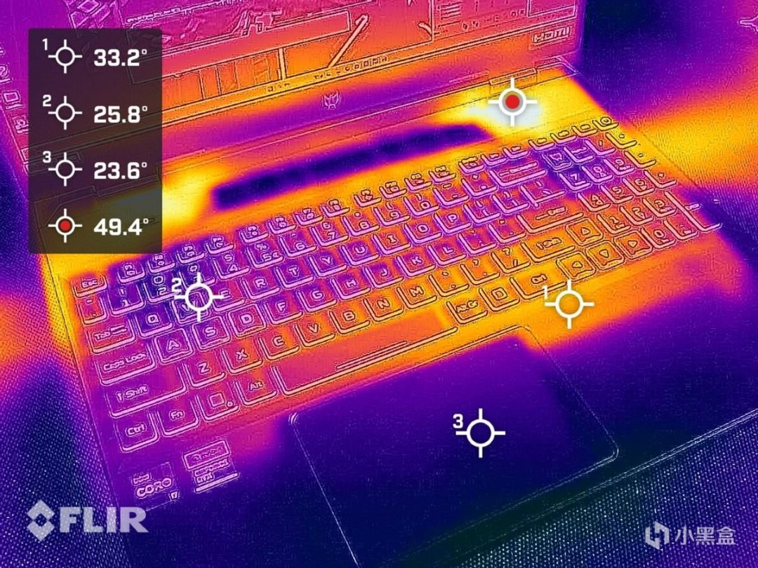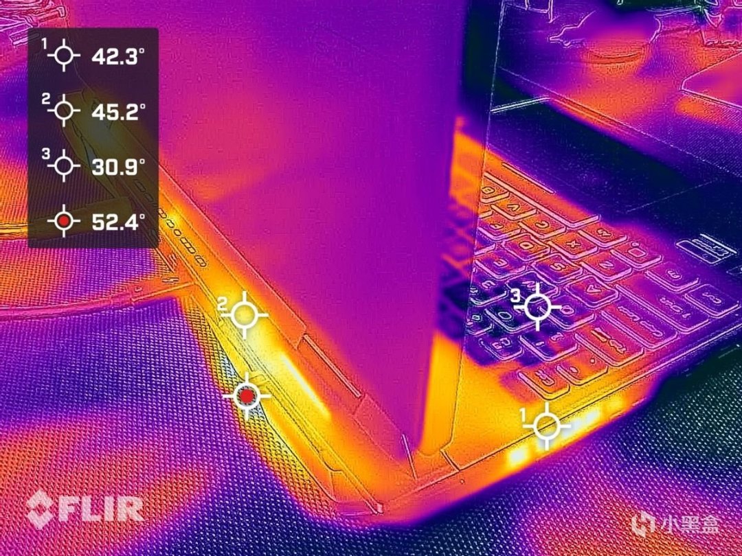 如果是在CPU、GPU雙烤模式下,也能看到熱量都集中在了四個出風口出,鍵盤、掌託和觸控板都保持着清涼狀態。