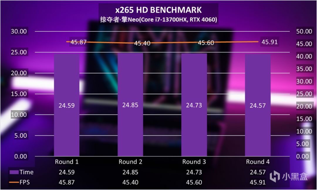 火力全開的極速模式下,特製的刀鋒速冷金屬雙風扇設計,配合液態金屬散熱、5熱管和4出風口讓散熱達到了不錯的效果。比如連續四次的x265 HD BENCHMARK視頻編碼中,可以看到掠奪者·擎Neo的性能衰減是幾乎可以忽略的。