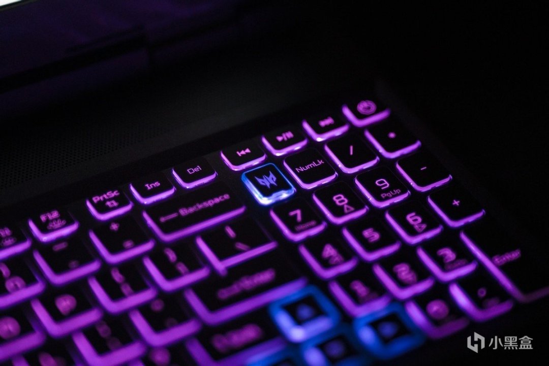 掠奪者·擎Neo屏幕很好打開,2.59kg的機身重量配合不錯的轉軸力度讓其能夠單手打開。C面的鍵盤設計感和手感不錯,撐滿16英寸筆記本的寬度讓每一個鍵帽都有足夠的面積,全尺寸方向鍵、ASDW以及專門調出控制中心的PREDATOR按鍵都做了特別的高亮處理。特別是夜間點亮鍵盤的時候,能夠更快定位按鍵。