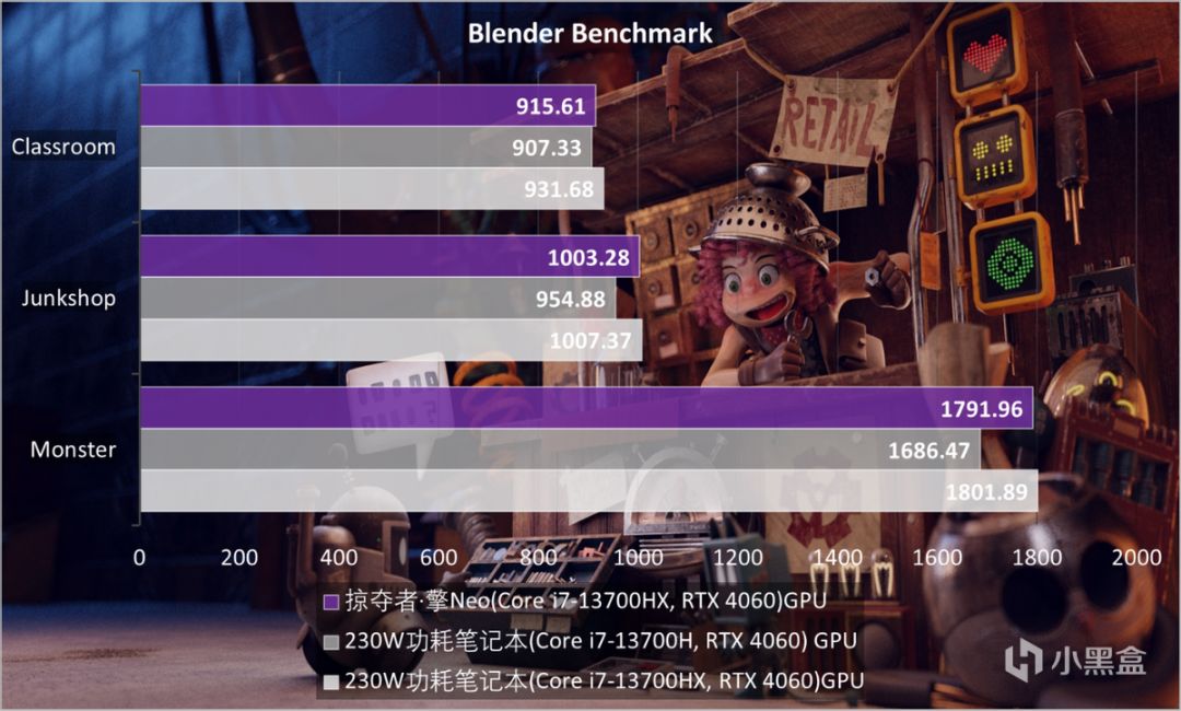 再比如Blender Benchmark主要用Moster、Junkshop、Classroom三個測試場景分別考驗CPU和GPU的渲染輸出能力。能夠看到光影精靈9的GPU性能釋放更強勢一些,CPU差距主要是在90W功耗的性能釋放喫了虧。