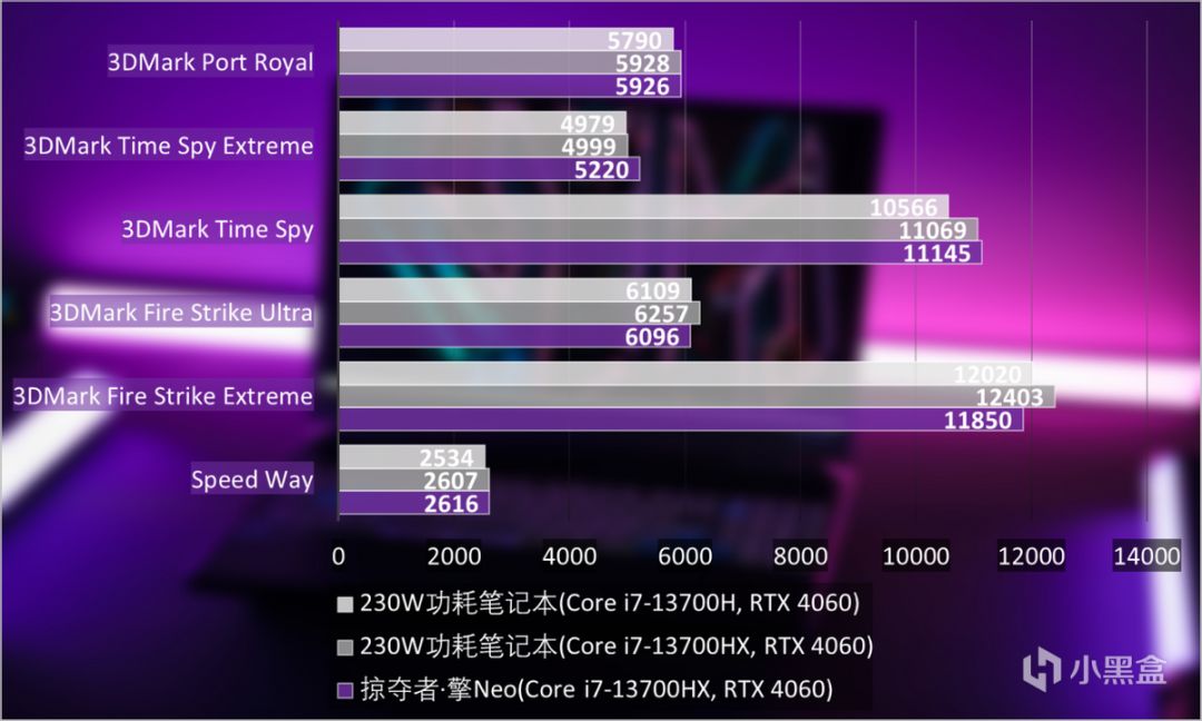 而事實證明這樣的性能釋放效果是立竿見影的。在常規的3DMark Fire Strike Extreme 、3DMark Fire Strike Ultra、3DMark Time Spy、3DMark Time Spy Extreme、3DMark Port Royal測試中,可以看到掠奪者·擎Neo對GPU有很好的性能釋放,如果用同功耗來推動GeForce RTX 4070 Laptop GPU,想必更爲亮眼。