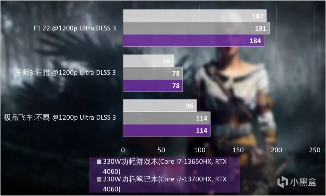 《巫師3:狂獵》和《極品飛車:不羈》都能在複雜的光線效果中流暢運行,《F1 22》更是接近200FPS。由於遊戲實際測試環境多少會有一些誤差,因此可以理解爲與對比的筆記本實際表現相當。GeForce RTX 4060 Laptop GPU已經釋放了所有性能。