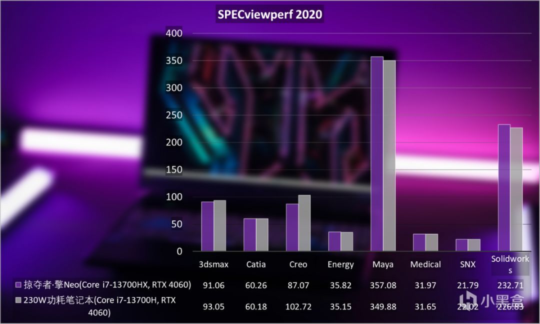 最後是工程專業常見的SPECviewperf 2020。這是一款包含能源勘探、醫學、建築設計、機械設計、汽車設計、飛機設計領域的專業軟件圖形測試,包括3dsmax、Catia、Creo、Energy、Maya、Medical、SNX、Solidworks等主流軟件。掠奪者·擎Neo部分場景表現優於是230W功耗,同樣定位遊戲與性能釋放的筆記本。