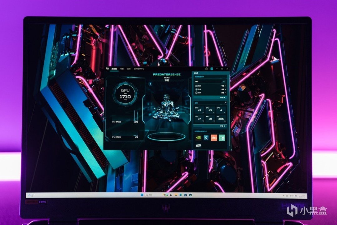 左上角遠離鍵盤的物理按鍵留給了場景切換。在Predator Sense提供了四擋性能釋放模式,分別是安靜、平衡、性能、極速。每按下一次物理按鍵,按鍵上的燈光也會在白色、藍色、紫色、玫紅色中依次變換,桌面右下角信息框也會提示當前的所處的釋放模式。
