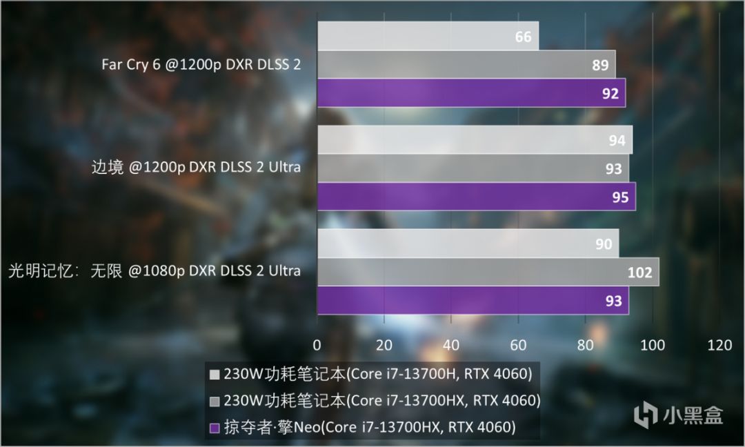 同樣在非DLSS 3遊戲測試中,我們將遊戲畫質設置爲光線追蹤最高畫質,分辨率設置成1920x1200,在性能上需求與1920x1080分辨率相當。可以看到掠奪者·擎Neo已經能讓遊戲接近100FPS表現,特別是《孤島驚魂6》中,Core i7-13700HX對開放場景加載提供了很大的幫助。